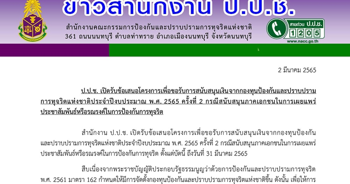 ป.ป.ช. เปิดรับข้อเสนอโครงการเพื่อขอรับการสนับสนุนเงินจากกองทุนป้องกันและปราบปรามการทุจริตแห่งชาติประจำปีงบประมาณ พ.ศ. 2565 ครั้งที่ 2 กรณีสนับสนุนภาคเอกชนในการเผยแพร่ประชาสัมพันธ์หรือรณรงค์ในการป้องกันการทุจริต