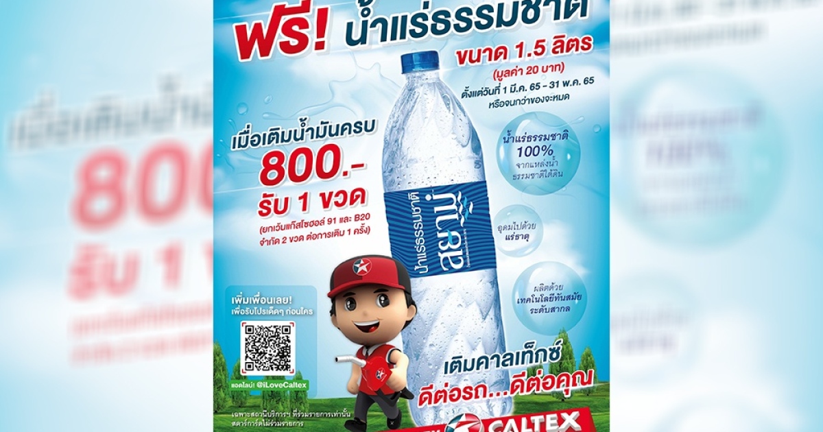 บริษัท เชฟรอน (ไทย) จำกัด ผู้ผลิตและจำหน่ายผลิตภัณฑ์คาลเท็กซ์ เตรียมพร้อมส่งพลังความสดชื่นให้กับลูกค้าคนพิเศษ จัดโปรโมชั่นล่าสุด “เติมคาลเท็กซ์ ดีต่อรถ...ดีต่อคุณ” สำหรับลูกค้าสถานีบริการน้ำมันคาลเท็กซ์สาขาที่ร่วมรายการทั่วประเทศ เพียงเติมน้ำมันชนิดใดก็ได้ (ยกเว้น คาลเท็กซ์ แก๊สโซฮอล์ 91 และ ดีเซล B20) ครบทุก 800 บาทขึ้นไปต่อใบเสร็จ รับฟรีทันที น้ำดื่มตราสยาม ขนาด 1.5 ลิตร มูลค่า 20 บาท จำนวน 1 ขวด โดยจำกัดการรับน้ำดื่มสูงสุดไม่เกิน 2 ขวด ต่อ 1 ใบเสร็จ (หรือที่ยอดเติมน้ำมัน 1,600 บาทขึ้นไป) ตั้งแต่วันนี้ จนถึงวันที่ 31 พฤษภาคม 2565 หรือจนกว่าสินค้าจะหมด ทั้งนี้ ข้อกำหนดและเงื่อนไขเป็นไปตามที่บริษัทฯ กำหนด
