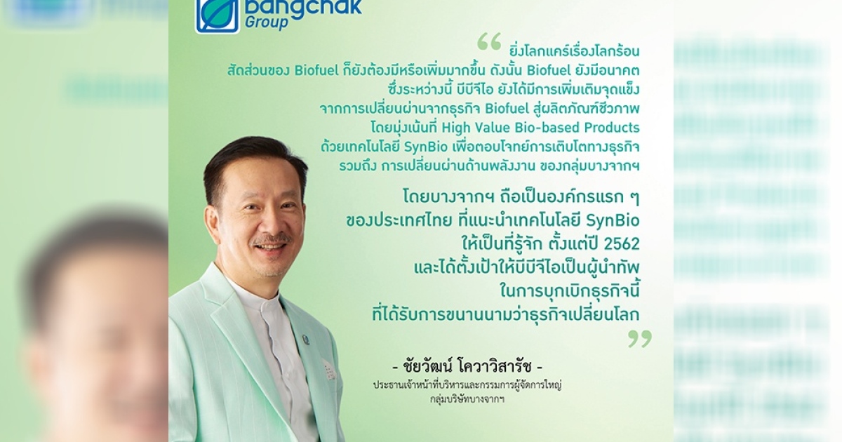 “ในขณะที่ทั่วโลกให้ความสำคัญเรื่องภาวะโลกร้อน สัดส่วนของเชื้อเพลิงชีวภาพก็ยังต้องมีหรือมีแต่จะเพิ่มมากขึ้น ดังนั้น เชื้อเพลิงชีวภาพจึงเป็นธุรกิจที่สำคัญและยังมีอนาคต และระหว่างนี้ บีบีจีไอ ซึ่งเป็นผู้นำด้านเชื้อเพลิงชีวภาพรายใหญ่ของประเทศยังได้มีการเพิ่มเติมจุดแข็ง ด้วยการปรับเปลี่ยนจากธุรกิจเชื้อเพลิงชีวภาพสู่ผลิตภัณฑ์ชีวภาพหรือ Bio-Based Products โดยมุ่งเน้นที่ HVP (High Value Bio-based Products - ผลิตภัณฑ์ชีวภาพมูลค่าสูง) ด้วยเทคโนโลยี SynBio เพื่อตอบโจทย์การเติบโตทางธุรกิจ รวมถึงการเปลี่ยนผ่านด้านพลังงานของกลุ่มบางจากฯ”