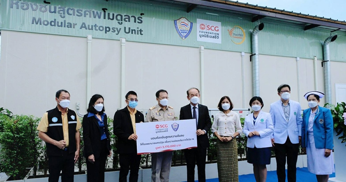 มูลนิธิเอสซีจี นำโดย คุณเชาวลิต เอกบุตร กรรมการบริหารมูลนิธิเอสซีจี พร้อมด้วยคุณสุวิมล จิวาลักษณ์ กรรมการและผู้จัดการมูลนิธิเอสซีจี ผนึกกำลังหอการค้าจังหวัดนครปฐม และมูลนิธิไทยพีบีเอส ร่วมส่งมอบห้องชันสูตรความดันลบ (Modular Autopsy unit) แห่งแรกของไทย มูลค่า 5.17 ล้านบาท ให้กับโรงพยาบาลนครปฐม โดยมี ดร.พญ.ดารารัตน์ รัตนรักษ์ ผู้อำนวยการโรงพยาบาลนครปฐม พร้อมด้วยคณะผู้บริหารโรงพยาบาลฯ ร่วมรับมอบ ซึ่งห้องชันสูตรความดันลบนี้ นอกจากจะลดอัตราเสี่ยงต่อการติดเชื้อ COVID-19 แล้ว ยังช่วยเพิ่มศักยภาพในการขยายการให้บริการชันสูตรศพกับจังหวัดนครปฐมและจังหวัดใกล้เคียงกว่า 700 ราย ต่อปี ลดภาระงานของโรงเรียนแพทย์ รวมถึงต่อยอดการศึกษาวิจัยเกี่ยวกับโรคโควิด 19 และโรคอุบัติใหม่ในอนาคต