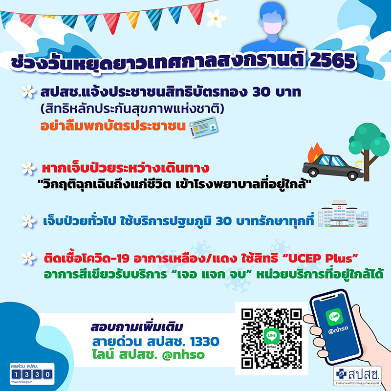 ทั้งนี้ สอบถามเพิ่มเติมการใช้สิทธิบัตรทอง สายด่วน สปสช. 1330 หรือช่องทางระบบออนไลน์ทั้งไลน์ สปสช. @nhso หรือคลิก https://lin.ee/zzn3pU6 และ Facebook : สำนักงานหลักประกันสุขภาพแห่งชาติ https://www.facebook.com/NHSO.Thailand