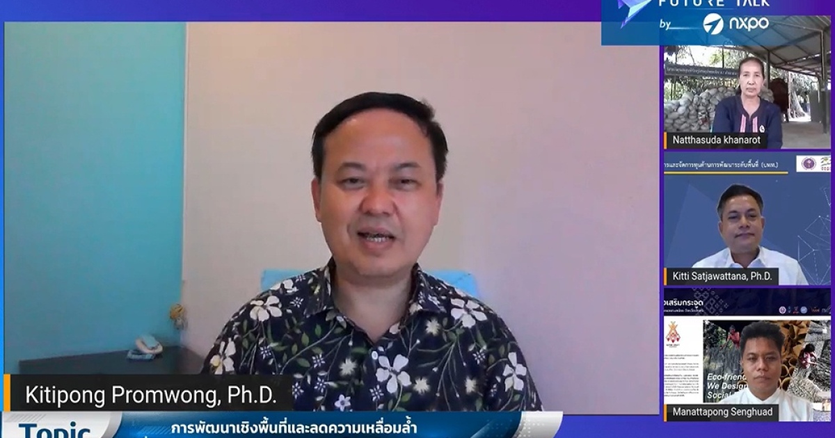 สำนักงานสภานโยบายการอุดมศึกษา วิทยาศาสตร์ วิจัยและนวัตกรรมแห่งชาติ (สอวช.) จัดรายการพูดคุยผ่านช่องทางออนไลน์ ในรายการ Future Talk by NXPO ครั้งที่ 10 ในประเด็น “การพัฒนาเชิงพื้นที่และลดความเหลื่อมล้ำเพื่อแก้ไขปัญหาความยากจนอย่างเบ็ดเสร็จและแม่นยำ” ซึ่งเป็นเป้าหมายหนึ่งของการพัฒนาอย่างยั่งยืน เพื่อพัฒนาคุณภาพชีวิตของคนจนให้ดีขึ้น โดยใช้องค์ความรู้วิทยาศาสตร์ เทคโนโลยี วิจัยและนวัตกรรม ด้วยการประสานพลังความร่วมมือของผู้เกี่ยวข้องทุกภาคส่วน ทั้งหน่วยงานภาครัฐ เอกชน หน่วยงานระดับพื้นที่ และภาคประชาสังคม โดยรายการในครั้งนี้ ได้รับเกียรติจาก ดร. กิตติ สัจจาวัฒนา ผู้อำนวยการหน่วยบริหารและจัดการทุนด้านการพัฒนาระดับพื้นที่ (บพท.) นายมนัทพงศ์ เซ่งฮวด ผู้ประกอบการจาก ศูนย์หัตถกรรมกระจูดวรรณี (ภายใต้โครงการวิจัยและนวัตกรรมแก้ปัญหาความยากจนแบบเบ็ดเสร็จและยั่งยืนจังหวัดพัทลุง โดยมหาวิทยาลัยทักษิณ วิทยาเขตพัทลุง) และนางณัฐสุดา คณาโรจน์ ประชาชนในพื้นที่ผู้ได้รับประโยชน์ ตำบลเสนาคนิคม อำเภอเสนางคนิคม จังหวัดอำนาจเจริญ (ภายใต้โครงการวิจัยเพื่อพัฒนาพื้นที่และแก้ไขปัญหาความยากจนแบบเบ็ดเสร็จและแม่นยำจังหวัดอำนาจเจริญ โดยมหาวิทยาลัยอุบลราชธานี) มาร่วมพูดคุย ดำเนินรายการโดย ดร. กิติพงค์ พร้อมวงค์ผู้อำนวยการ สอวช.
