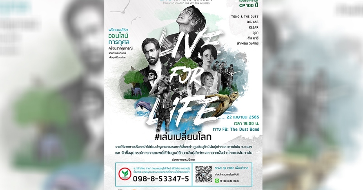 “Tono and The Dust Live For Life #เล่นเปลี่ยนโลก” เป็นคอนเสิร์ตออนไลน์การกุศลเพื่อสิ่งแวดล้อมเต็มรูปแบบจัดแสดงสดผ่าน Live Stream ในวันที่ 22 เมษายน 2565 เวลา 19.00 น.ทาง Facebook เพจ: The Dust Band และ ติดตามรับชมได้ที่แอปทรูไอดี ช่อง ID Station ทั้งทางเวปไซต์, แอปพลิเคชั่น และ กล่อง TrueID TV ช่อง 894 ถือเป็นความร่วมมือกับภาคีเครือข่ายต่าง ๆ ที่มีเจตนารมณ์เดียวกันเพื่อสร้างปรากฎการณ์ครั้งสำคัญ โดยจะบอกเล่าเรื่องราวและความรู้สึกผ่านบทเพลงที่สะท้อนให้เห็นถึงปัญหาของสังคมและสิ่งแวดล้อม ซึ่งได้รับความร่วมแรงร่วมใจจากศิลปินรับเชิญเพื่อนพี่น้องในวงการที่มาร่วมกันอย่างคับคั่ง อาทิ เจ๋ง Big Ass , แพท Klear , เอ๋ Ebola , ลำเพลิน วงศกร , ส้ม มารี และ ลุลา ที่จะมาร่วมรณรงค์สร้างความตระหนักรู้และปลูกจิตสำนึกให้คนในสังคมร่วมกันอนุรักษ์ฟื้นฟูทรัพยากรทางทะเลไทยให้ยั่งยืน พร้อมชวนคนไทยช่วยกันบริจาคระดมทุนช่วยเต่าทะเลไทย ตั้งแต่วันนี้ไปจนถึง 31 พฤษภาคม 2565 โดยสามารถบริจาคสมทบทุนผ่านช่องทางการบริจาค “เทใจดอทคอม” หรือ https://taejai.com/th/ หรือบริจาคโดยโอนเงินผ่านบัญชีธนาคารกสิกรไทย สาขาถนนเพชรบุรีตัดใหม่ (อิตัลไทย ทาวเวอร์) ชื่อบัญชี มูลนิธิบูรณะชนบทแห่งประเทศไทยฯ เพื่อโครงการเทใจ เลขที่บัญชี 098-8-53347-5 นับเป็นอีกหนึ่งช่วงเวลาสำคัญที่ทุกคนสามารถร่วมกันทำให้โลกใบนี้น่าอยู่อย่างยั่งยืน