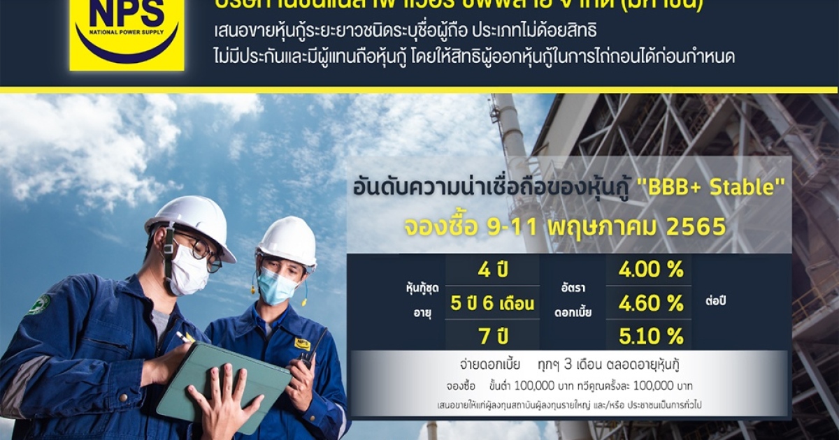 บริษัท เนชั่นแนล เพาเวอร์ ซัพพลาย จำกัด (มหาชน) หรือ NPS เสนอขายหุ้นกู้ครั้งที่ 1/2565 ให้ประชาชนทั่วไป ผู้ลงทุนสถาบัน และ/หรือผู้ลงทุนรายใหญ่ เป็นหุ้นกู้ระยะยาวชนิดระบุชื่อผู้ถือ ประเภทไม่ด้อยสิทธิ ไม่มีประกันและมีผู้แทนผู้ถือหุ้นกู้ โดยให้สิทธิผู้ออกหุ้นกู้ในการไถ่ถอนได้ก่อนกำหนด จำนวนของหุ้นกู้ที่เสนอขายทั้งหมด 3 ชุด แบ่งออกเป็น