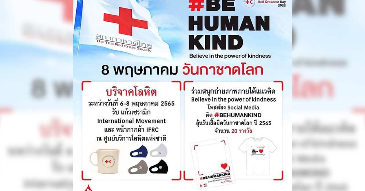 8 พฤษภาคม วันกาชาดโลก ขอเชิญบริจาคโลหิต ระหว่างวันที่ 6-8 พฤษภาคม 2565 พร้อมรับแก้วเซรามิก International Movement และหน้ากากผ้า IFRC ณ ศูนย์บริการโลหิตแห่งชาติ สภากาชาดไทย และร่วมสนุกถ่ายภาพ ภายใต้ แนวคิด Believe in the power of kindness โพสต์ลง Social Media ติด #BEHUMANKIND ลุ้นรับเสื้อยืดวันกาชาดโลก 2565 จำนวน 20 รางวัล