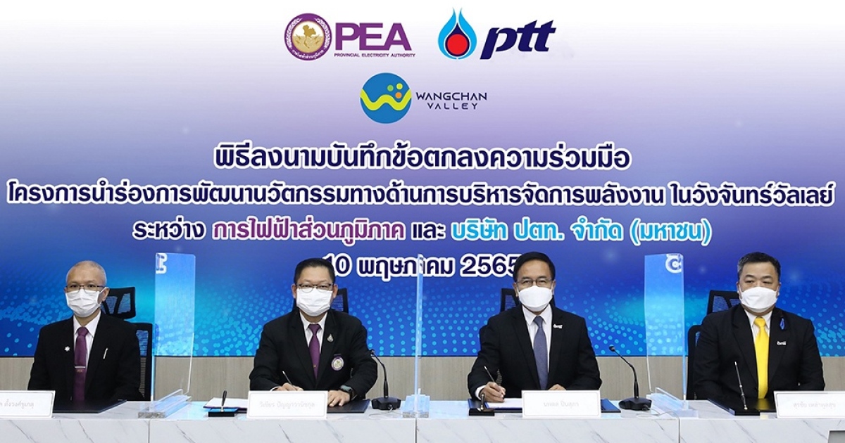 เมื่อวันที่ 10 พฤษภาคม 2565 นายนพดล ปิ่นสุภา ประธานเจ้าหน้าที่ปฏิบัติการกลุ่มธุรกิจใหม่และโครงสร้างพื้นฐาน บริษัท ปตท. จำกัด (มหาชน) (ที่ 2 จากขวา) นายสุรชัย เหล่าพูลสุข ผู้ช่วยกรรมการผู้จัดการใหญ่ ทำหน้าที่ ผู้อำนวยการโครงการนวัตกรรมระเบียงเศรษฐกิจภาคตะวันออก บริษัท ปตท. จำกัด (มหาชน) (ขวา) นายวิเชียร ปัญญาวานิชกุล รองผู้ว่าการวางแผนและพัฒนาระบบไฟฟ้า การไฟฟ้าส่วนภูมิภาค (ที่ 2 จากซ้าย) และ นายจรัล ตั้งวงศ์ชูเกตุ ผู้อำนวยการฝ่ายส่งเสริมพลังงานทดแทนและอนุรักษ์พลังงาน การไฟฟ้าส่วนภูมิภาค (ซ้าย) ลงนามบันทึกข้อตกลงความร่วมมือระหว่าง บริษัท ปตท. จำกัด (มหาชน) และ การไฟฟ้าส่วนภูมิภาค เพื่อร่วมกันดำเนินงานโครงการนำร่องการพัฒนานวัตกรรมทางด้านการบริหารจัดการพลังงานในพื้นที่เมืองอัจฉริยะวังจันทร์วัลเลย์ ด้วยการใช้พลังงานอย่างมีประสิทธิภาพ เสริมความมั่นคงของระบบไฟฟ้า มุ่งใช้พลังงานทดแทนและพลังงานสะอาด เน้นการนำเทคโนโลยีและนวัตกรรมดิจิทัล มาสนับสนุนการให้บริการด้านพลังงาน อาทิ การนำแพลตฟอร์มซื้อขายแลกเปลี่ยนและบริหารจัดการพลังงานไฟฟ้ารูปแบบใหม่มาทดลองใช้ในพื้นที่ เพื่อ พัฒนาการจัดการระบบจำหน่ายไฟฟ้าแบบ Smart Grid การนำเข้าพลังงานไฟฟ้าจากภายนอกพื้นที่โครงการผ่านระบบสายส่งของ กฟภ. การจัดการแหล่งพลังงานภายในและนอกพื้นที่โครงการให้เป็นเครือข่ายเดียวกัน มีเสถียรภาพสูง ผ่านเทคโนโลยี IoT ตลอดจนมีการควบคุมปริมาณการปลดปล่อยก๊าซเรือนกระจกในพื้นที่โครงการ ผ่านการผลิตและใช้พลังงานทดแทนในรูปแบบ Prosumer การใช้ระบบผลิตพลังงานที่เป็นมิตรกับสิ่งแวดล้อม การใช้ระบบกักเก็บพลังงาน การบริหารจัดการและใช้ประโยชน์ของ Renewable Energy Certificate (REC) รวมถึงการนำเข้าพลังงานสะอาดจากภายนอกพื้นที่ เพื่อเป็นต้นแบบของการพัฒนาเมืองอัจฉริยะสู่ความเป็นกลางทางคาร์บอน (Carbon Neutrality) และการบริหารจัดการไฟฟ้าอย่างมีประสิทธิภาพ สำหรับพื้นที่อื่น ๆ ของประเทศไทยได้ต่อไปในอนาคต