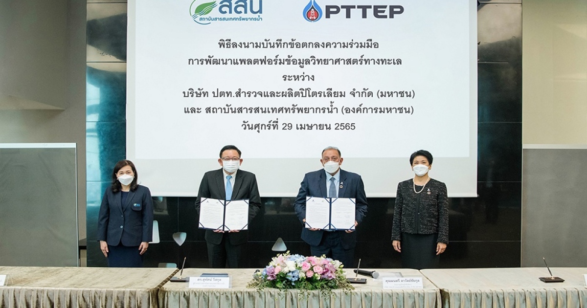 นายมนตรี ลาวัลย์ชัยกุล (ที่ 2 จากขวา) ประธานเจ้าหน้าที่บริหาร บริษัท ปตท.สำรวจและผลิตปิโตรเลียม จำกัด (มหาชน) หรือ ปตท.สผ. และ ดร.สุทัศน์ วีสกุล (ที่ 2 จากซ้าย) ผู้อำนวยการ สถาบันสารสนเทศทรัพยากรน้ำ (องค์การมหาชน) หรือ สสน. ร่วมลงนามบันทึกข้อตกลงความร่วมมือการพัฒนาแพลตฟอร์มข้อมูลวิทยาศาสตร์ทางทะเล (Ocean Data Platform) ซึ่งเป็นพื้นที่ในการเก็บรวบรวม แลกเปลี่ยน เชื่อมโยงฐานข้อมูลวิทยาศาสตร์ทางทะเล เพื่อให้สามารถนำไปใช้ให้เกิดประโยชน์ต่อสิ่งแวดล้อมและสาธารณชน ตามกลยุทธ์ “ทะเลเพื่อชีวิต” (Ocean for Life) ของ ปตท.สผ. ในการสร้างความยั่งยืนของระบบนิเวศทางทะเลและสังคมเศรษฐกิจภาคทะเล ณ ศูนย์เอนเนอร์ยี่ คอมเพล็กซ์ กรุงเทพฯ