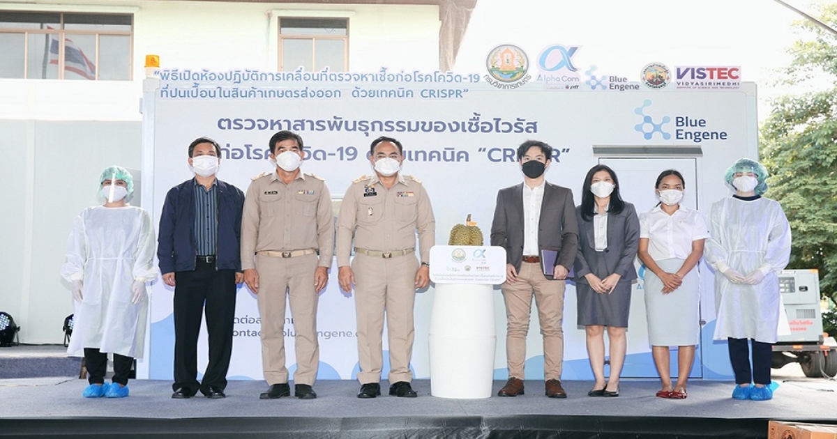 เมื่อเร็วๆ นี้ นายสุธี ทองแย้ม ผู้ว่าราชการจังหวัดจันทบุรี (ที่ 4 จากซ้าย) นายชลธี นุ่มหนู ผู้อำนวยการสำนักวิจัยและพัฒนาการเกษตรเขตที่ 6 (ที่ 3 จากซ้าย) นายไกรยสิทธิ์ อินทรพาณิชย์ ผู้ช่วยกรรมการผู้จัดการใหญ่พัฒนาธุรกิจโลจิสติกส์และโครงสร้างพื้นฐาน บริษัท ปตท. จำกัด (มหาชน) (ที่ 2 จากซ้าย) นายคเณศ กาญจนแก้ว กรรมการผู้จัดการบริษัท อัลฟ่า คอม จำกัด (ที่ 4 จากขวา) ดร.พรรณวิกา พรรณโณภาศ นักวิจัยวิทยาศาสตร์ ศูนย์วิจัยวิทยาศาสตร์และเทคโนโลยีชั้นแนวหน้า (FRC) สถาบันวิทยสิริเมธี (VISTEC) (ที่ 3 จากขวา) และดร. วนิดา เพ็ชรสังข์ ผู้อำนวยการโครงการ BLUE ENGENE บริษัท อัลฟ่า คอม จำกัด (ที่ 2 จากขวา) ร่วมพิธีเปิด “ห้องปฏิบัติการเคลื่อนที่ (Mobile lab) ตรวจหาเชื้อก่อโรคโควิด-19 ที่ปนเปื้อนในสินค้าเกษตรส่งออก ด้วยเทคนิค CRISPR” โดยเป็นความร่วมมือระหว่างสำนักวิจัยและพัฒนาการเกษตรเขตที่ 6 กรมวิชาการเกษตร และ บริษัท อัลฟ่า คอม จำกัด บริษัทย่อยของ ปตท. เพื่อสนับสนุนการทำงานของภาครัฐในการตรวจหาเชื้อโควิด-19 ในผลไม้ส่งออก โดย Mobile lab นี้ เป็นการเก็บตัวอย่างและตรวจหาเชื้อโควิด-19 ด้วยเทคนิค CRISPR (คริสเปอร์) ซึ่งเป็นการตรวจหาสารพันธุกรรมของเชื้อ SARS-CoV-2 (เชื้อก่อโรค COVID - 19) ได้อย่างแม่นยำ อีกทั้งยังสามารถเคลื่อนย้าย เพื่อให้บริการตรวจตามพื้นที่ต่าง ๆ ได้อย่างรวดเร็ว เสริมประสิทธิภาพการค้นหาเชิงรุก โดยจะเริ่มนำร่องให้บริการตรวจหาเชื้อโควิด-19 ที่อาจปนเปื้อนอยู่บนทุเรียนที่เตรียมส่งออกในพื้นที่เขตภาคตะวันออก จำนวน 2,000 ตัวอย่าง โดยไม่มีค่าใช้จ่าย แม้ว่าขณะนี้ประเทศไทยจะยังไม่มีห้องแลบตรวจหาสารพันธุกรรมของเชื้อ SARS-CoV-2 ปนเปื้อนในสินค้าเกษตร ที่ได้รับการรับรองอย่างเป็นทางการจากประเทศจีน แต่ความร่วมมือในครั้งนี้จะช่วยเสริมสร้างความเชื่อมั่นให้ผู้บริโภคและประเทศคู่ค้า อีกทั้งบรรเทาความเดือดร้อนของเกษตรกรและสนับสนุนการดำเนินงานของภาครัฐ เพื่อพลิกฟื้นเศรษฐกิจและธุรกิจโลจิสติกส์ของไทยในเวทีโลกให้เติบโต แข็งแกร่ง และเป็นศูนย์กลางการส่งออกทางการเกษตรที่สำคัญของภูมิภาคอาเซียนต่อไป