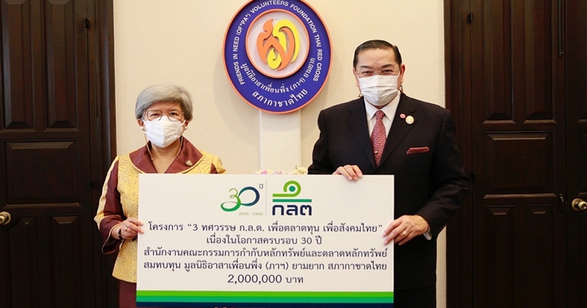 เมื่อวันที่ 6 มิถุนายน 2565 ณ สำนักงานมูลนิธิอาสาเพื่อนพึ่ง(ภา)ยามยาก สภากาชาดไทย อาคารมหินทรเดชานุวัตน์ ถนนเพชรบุรี กทม. สำนักงานคณะกรรมการกำกับหลักทรัพย์และตลาดหลักทรัพย์ (ก.ล.ต.) นำโดย คุณรื่นวดี สุวรรณมงคล เลขาธิการ ก.ล.ต. และคณะ เข้ามอบเงินเนื่องในโอกาส ก.ล.ต.มีอายุครบ30ปี ให้แก่มูลนิธิอาสาเพื่อนพึ่ง (ภาฯ) ยามยาก สภากาชาดไทย จำนวน 2,000,000 บาท เพื่อสมทบทุนในการบรรเทาทุกข์ช่วยเหลือผู้ประสบอุทกภัยตามภาระกิจของมูลนิธิฯ โดยมี ศาสตราจารย์พิเศษ ดร.สุรเกียรติ์ เสถียรไทย รองประธานกรรมการที่ปรึกษา และประธานกรรมการบริหารมูลนิธิ ฯ และคุณฐิติวัฒน์ ว่องวรรณกุล กรรมการและผู้จัดการมูลนิธิฯ และทีมงานฝ่ายต่างๆเป็นผู้รับมอบ