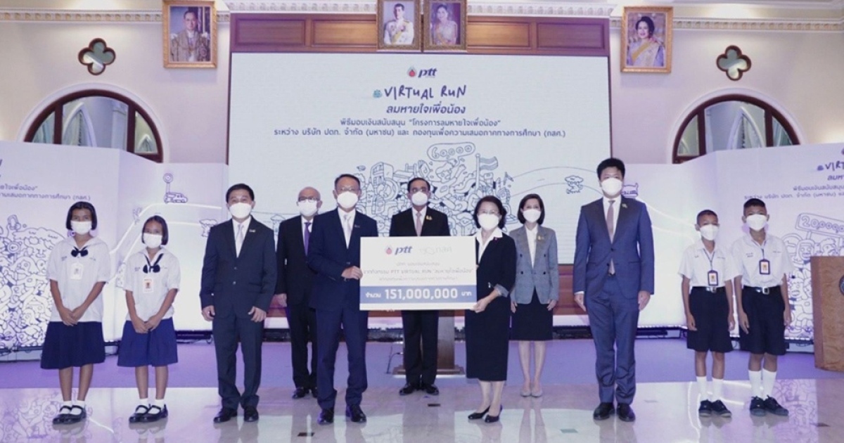 พลเอกประยุทธ์ จันทร์โอชา นายกรัฐมนตรี เป็นประธานในพิธีมอบเงินสนับสนุนการศึกษาเยาวชน จากกิจกรรม PTT Virtual Run ภายใต้ 'โครงการลมหายใจเพื่อน้อง' ของ บริษัท ปตท. จำกัด (มหาชน) (ปตท.) โดย ศาสตราจารย์พิเศษ ดร.ทศพร ศิริสัมพันธ์ ประธานกรรมการ ปตท. เป็นผู้แทนมอบเงินจำนวน 151 ล้านบาท ให้แก่ รศ. ดร. ดารณี อุทัยรัตนกิจ กรรมการบริหารกองทุนเพื่อความเสมอภาคทางการศึกษา (กสศ.) เพื่อคืนโอกาสทางการศึกษาให้แก่เด็กและเยาวชนในช่วงชั้นรอยต่อ ที่มีความเสี่ยงหลุดออกจากระบบการศึกษาในปี 2565 ให้สามารถกลับเข้าสู่ระบบอย่างต่อเนื่อง โดยมี นายสุพัฒนพงษ์ พันธ์มีเชาว์ รองนายกรัฐมนตรีและรัฐมนตรีว่าการกระทรวงพลังงาน นางสาวตรีนุช เทียนทอง รัฐมนตรีว่าการกระทรวงศึกษาธิการ นายอธิคม เติบศิริ ประธานเจ้าหน้าที่ปฏิบัติการกลุ่มธุรกิจปิโตรเลียมขั้นต้นและก๊าซธรรมชาติ บริษัท ปตท. จำกัด (มหาชน) และ ดร.ไกรยส ภัทราวาท ผู้จัดการกองทุนเพื่อความเสมอภาคทางการศึกษา เข้าร่วม ณ ทำเนียบรัฐบาล