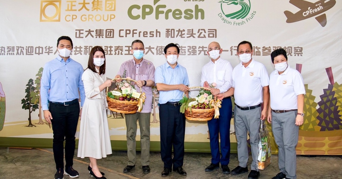 เมื่อวันที่ 10 มิถุนายน 2565 นายหาน จื้อเฉียง เอกอัครราชทูต สาธารณรัฐประชาชนจีน ประจำประเทศไทย, นายหวาง ลี่ผิง อัครราชทูตที่ปรึกษาแผนกพาณิชย์ พร้อมคณะ เดินทางเยี่ยมชมโรงคัดบรรจุผลไม้ ดราก้อน เฟรช ฟรุท อ.มะขาม จ.จันทบุรี พันธมิตรสำคัญของซีพี เฟรช โดยมีนายสุธี ทองแย้ม ผู้ว่าราชการจังหวัดจันทบุรี พร้อมด้วย นายสมชวน รัตนมังคลานนท์ รองปลัดกระทรวงเกษตรและสหกรณ์ , ดร.วนิดา กำเนิดเพ็ชร์ ผู้อำนวยการสำนักการเกษตรต่างประเทศ กระทรวงเกษตรและสหกรณ์, นายสัญชัย ปุรณะชัยคีรี นายกสมาคมผู้ค้าและส่งออกผลไม้ไทย, นางรัตนา ปุรณะชัยคีรี กรรมการผู้จัดการ บริษัทดราก้อน เฟรช ฟรุท, นายไพศาลย์ ยังสมบูรณ์ ผู้อำนวยการฝ่ายบัญชี ซีพี กรุ๊ป เขตประเทศจีน, นายจอมกิตติ ศิริกุล รองกรรมการผู้จัดการอาวุโส ด้านพัฒนาความยั่งยืนภาครัฐและกิจการสัมพันธ์ เครือเจริญโภคภัณฑ์ และนางสาวณัชชาชนก ณ ตะกั่วทุ่ง สปอนเซอร์โครงการผักผลไม้ ภายใต้โครงการพัฒนาพิเศษ เครือเจริญโภคภัณฑ์ ให้การต้อนรับ และนำคณะเยี่ยมชม กระบวนการคัดเลือกทุเรียน ฆ่าเชื้อโรค บรรจุ และขนส่งไปยังประเทศจีน