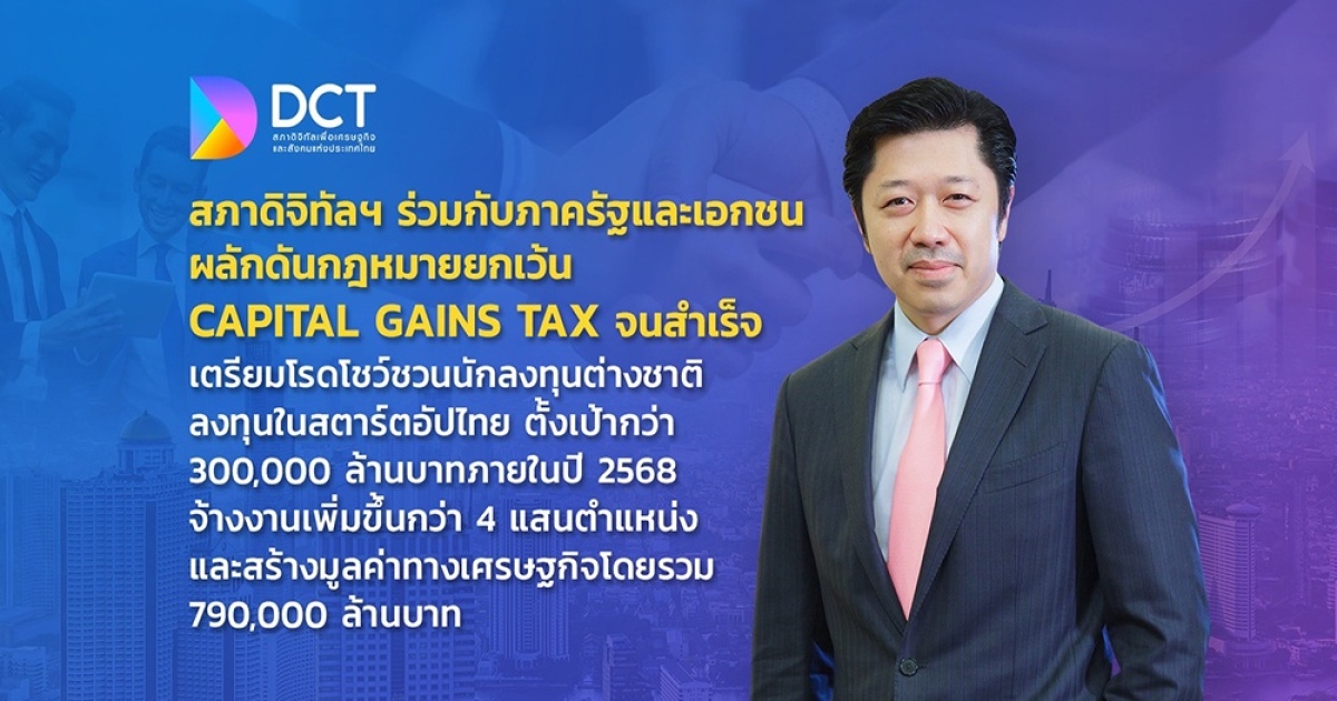 วันที่ 16 มิถุนายน 2565 สภาดิจิทัลเพื่อเศรษฐกิจและสังคมแห่งประเทศไทยแสดงความชื่นชมรัฐบาลและขอบคุณพันธมิตรทั้งภาครัฐและเอกชนที่ร่วมผลักดันกฎหมายยกเว้นภาษี Capital Gains เป็นเวลา 10 ปี แก่นักลงทุนไทยและต่างชาติที่เข้ามาลงทุนในสตาร์ทอัพไทยจนสำเร็จ โดยเมื่อ 14 มิถุนายน 2565 รัฐบาลได้ประกาศพระราชกฤษฎีกา(พรฎ.) ยกเว้นภาษี Capital Gains เป็นเวลา 10 ปี ถือเป็นความสำเร็จก้าวแรกในการรวมพลังช่วยกันขับเคลื่อนเศรษฐกิจของไทยให้เติบโตอย่างแข็งแกร่ง เพิ่มขีดความสามารถในการระดมทุนสู่วิสาหกิจเริ่มต้น หรือสตาร์ทอัพได้มากขึ้น คาดกระตุ้นการจ้างงานทักษะดิจิทัลขั้นสูงในประเทศ 500,000 ราย ดึงดูดต่างชาติมาลงทุนในประเทศไทยกว่า 10,000 ราย เชื่อมั่นเม็ดเงินลงทุนไหลเข้าไทยไม่ต่ำกว่า 300,000 ล้านบาทในปี 2568 เร่งเดินหน้าโรดโชว์และกิจกรรมสร้างความเชื่อมั่นแก่นักลงทุนกลุ่มเป้าหมายทั้งไทยและต่างประเทศ รวมทั้งกลุ่มสตาร์ทอัพทันที