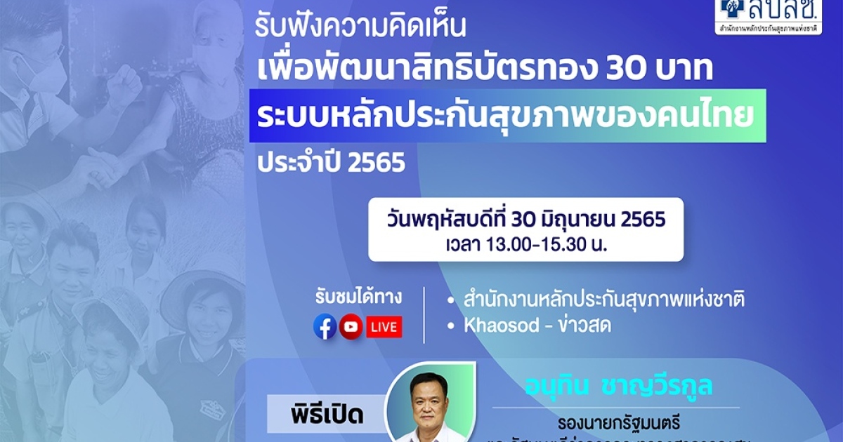 นพ.เจษฎา โชคดำรงสุข ประธานอนุกรรมการสื่อสารสังคมและรับฟังความคิดเห็นจากผู้ให้และผู้รับบริการ สำนักงานหลักประกันสุขภาพแห่งชาติ (สปสช.) กล่าว่า ตามที่ สปสช.ได้จัดการรับฟังความคิดเห็นทั่วไประดับประเทศจากผู้ให้บริการและผู้รับบริการ ประจำปี 2565 ในวันที่ 30 มิถุนายน 2565 ตั้งแต่เวลา 13:00-15:30 น. ผ่านช่องทาง Facebook Live สำนักงานหลักประกันสุขภาพแห่งชาติ โดยมีนายอนุทิน ชาญวีรกูล รองนายกรัฐมนตรี และรัฐมนตรีว่าการกระทรวงสาธารณสุข ในฐานะประธานกรรมการหลักประกันสุขภาพแห่งชาติ เป็นประธาน สปสช.ขอเชิญชวนประชาชนและผู้ที่เกี่ยวข้องร่วมแสดงความเห็นเพื่อนำไปสู่การพัฒนาระบบหลักประกันสุขภาพแห่งชาติ (สิทธิบัตรทอง/30 บาท)