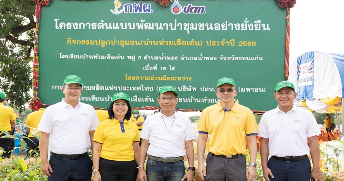นายวุฒิกร สติฐิต รองกรรมการผู้จัดการใหญ่หน่วยธุรกิจก๊าซธรรมชาติ บริษัท ปตท. จำกัด (มหาชน) (ปตท.) (กลาง) และ นางราณี โฆษิตวานิช รองผู้ว่าการเชื้อเพลิง การไฟฟ้าฝ่ายผลิตแห่งประเทศไทย (กฟผ.) (ที่ 2 จากซ้าย) ร่วมเป็นประธานในพิธีเปิดโครงการต้นแบบพัฒนาป่าชุมชนอย่างยั่งยืน ปตท. – กฟผ. โดยกิจกรรมครั้งนี้มีผู้บริหาร ปตท. กฟผ. หัวหน้าหน่วยราชการ ผู้นำชุมชน และชุมชน ร่วมกันปลูกต้นไม้พื้นถิ่น จำนวน 2,000 ต้น บนพื้นที่ 15 ไร่ ณ โรงเรียนบ้านห้วยเสือเต้น อำเภอน้ำพอง จังหวัดขอนแก่น พร้อมทั้งมอบพันธุ์ไม้กินได้ จำนวน 1,000 ต้น อาทิ ขี้เหล็ก สะเดา เพกา เพื่อเป็นไม้พี่เลี้ยงและเป็นแหล่งอาหารให้แก่ชุมชนในอนาคต ทั้งนี้ โครงการฯ นี้ เป็นการร่วมมือระหว่าง ปตท. และ กฟผ. ที่มุ่งหวังให้เป็นต้นแบบในการสร้างความยั่งยืนด้านสิ่งแวดล้อมให้แก่ชุมชนอำเภอน้ำพอง นอกจากนี้ สถาบันปลูกป่าและระบบนิเวศ ปตท. ได้สนับสนุนการถ่ายทอดองค์ความรู้ คำแนะนำในการปลูกไม้พื้นถิ่นให้แก่ชุมชน เพื่อพัฒนาต่อยอดให้เกิดเป็นเศรษฐกิจหมุนเวียนในอนาคต และร่วมกันขับเคลื่อนประเทศสู่สังคมคาร์บอนต่ำต่อไป