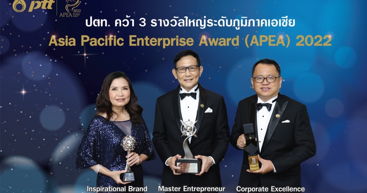 บริษัท ปตท. จำกัด (มหาชน) เข้ารับรางวัล Asia Pacific Enterprise Awards 2022 (APEA 2022) จำนวน 3 รางวัล โดย นายอรรถพล ฤกษ์พิบูลย์ ประธานเจ้าหน้าที่บริหารและกรรมการผู้จัดการใหญ่ ปตท. รับรางวัลยอดเยี่ยมของผู้นำองค์กร (Master Entrepreneur Award) นางสาวพรรณนลิน มหาวงศ์ธิกุล ประธานเจ้าหน้าที่บริหารการเงิน รับรางวัลด้านกลยุทธ์แบรนด์ที่สะท้อนความยั่งยืน (Inspirational Brand Award) และ นายสุชาติ ระมาศ รองกรรมการผู้จัดการใหญ่บริหารศักยภาพองค์กรและธรรมาภิบาล รับรางวัลที่แสดงความเป็นเลิศขององค์กร (Corporate Excellence Award)