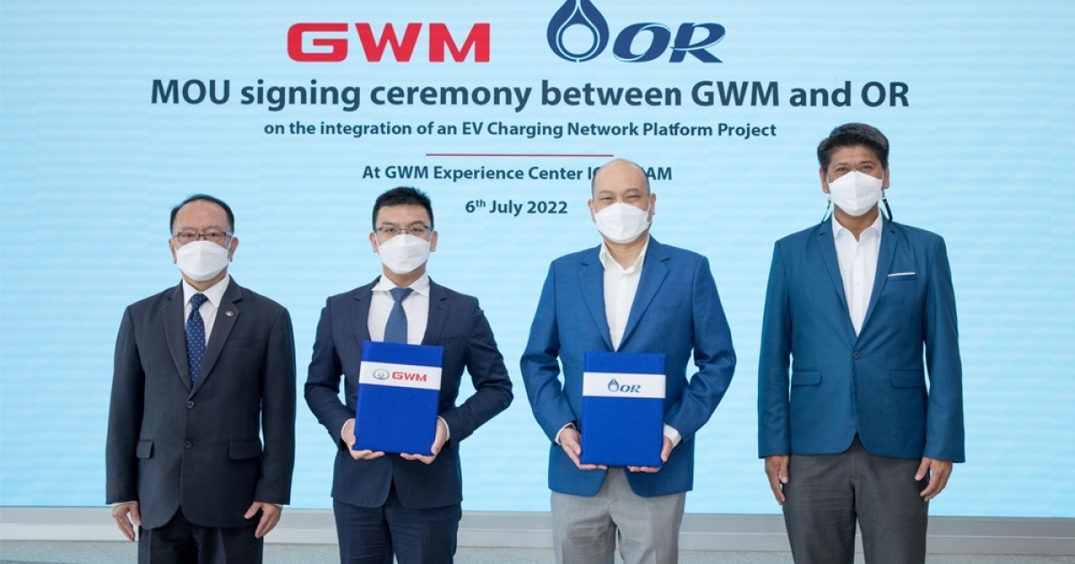 นายวิศน สุนทราจารย์ รองกรรมการผู้จัดการใหญ่กลยุทธ์องค์กร และความยั่งยืน บริษัท ปตท. น้ำมันและการค้าปลีก จำกัด (มหาชน) (OR) และ นายไมเคิล ฉง รองประธาน บริษัท เกรท วอลล์ มอเตอร์ (ประเทศไทย) จำกัด (GWM) ร่วมพิธีลงนามบันทึกข้อตกลงความร่วมมือ ในการเชื่อมโยงแพลตฟอร์มระบบโครงข่ายสถานีอัดประจุไฟฟ้า ระหว่าง OR และ GWM เพื่อร่วมศึกษาและพัฒนาแพลตฟอร์มเพื่อเชื่อมโยงระบบโครงข่ายสถานีอัดประจุไฟฟ้า (Roaming) ในสถานีชาร์จ EV Station PluZ