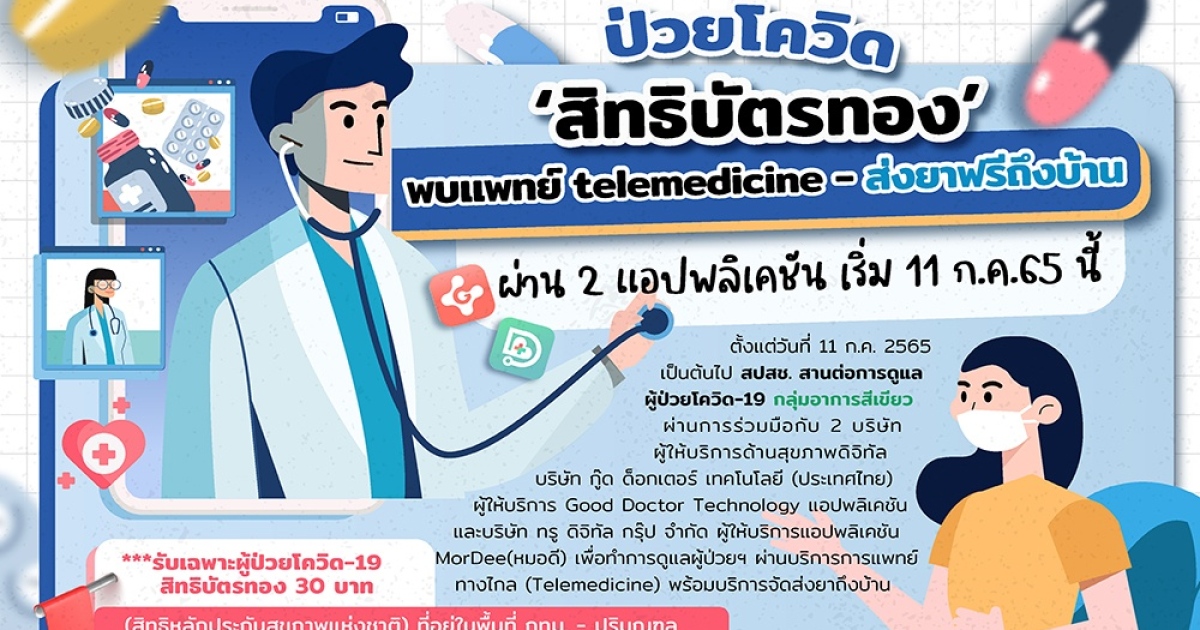 สปสช. จับมือ แอป 'กู๊ด ดอกเตอร์' และแอป 'MorDee (หมอดี)' ร่วมดูแลผู้ติดเชื้อโควิด-19 กลุ่มสีเขียว สิทธิบัตรทอง 30 บาท เฉพาะ กทม.และปริมณฑล รับการรักษาแบบ 'ผู้ป่วยนอกและแยกกักตัวที่บ้าน' ผ่านบริการการแพทย์ทางไกล หากตรวจ ATK ผลเป็น 2 ขีด ลงทะเบียนเลือกเข้ารับบริการ เพื่อพบแพทย์ผ่านออนไลน์ ซักถามและจ่ายยาตามอาการ ให้คำแนะนำการใช้ยารักษาโควิด-19 พร้อมจัดส่งถึงบ้าน ฟรี ไม่เสียค่าใช้จ่าย รับบริการได้แล้ววันนี้