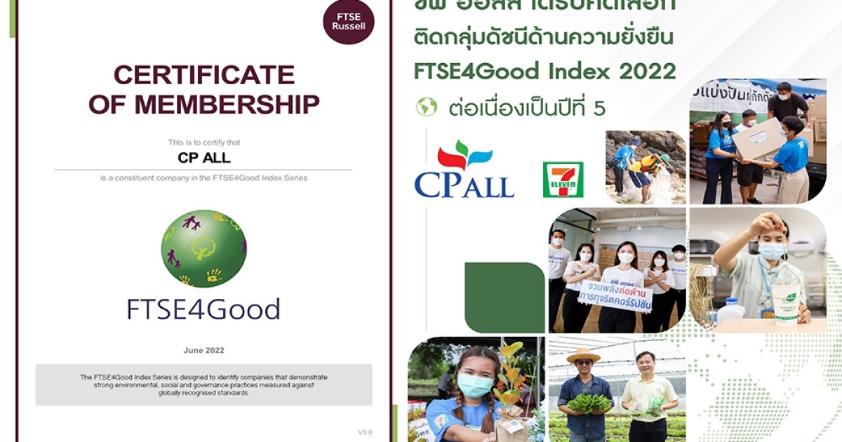 ซีพี ออลล์ ได้รับคัดเลือกติดกลุ่มดัชนี FTSE4Good Index 2022 ต่อเนื่องเป็นปีที่ 5