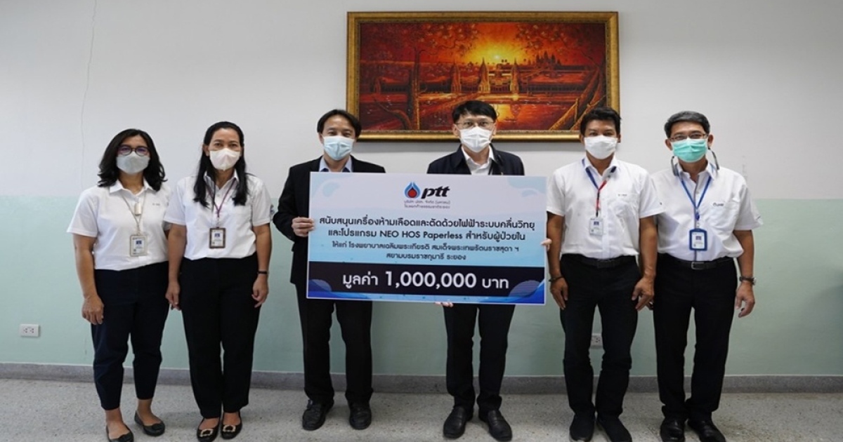 นายสรไนย เลิศอักษร ผู้ช่วยกรรมการผู้จัดการใหญ่แยกก๊าซธรรมชาติ บริษัท ปตท.จำกัด (มหาชน) ส่งมอบเครื่องห้ามเลือดและตัดด้วยไฟฟ้าระบบคลื่นวิทยุและโปรแกรม NEO HOS Paperless ซึ่งเป็นเทคโนโลยีใหม่ที่ช่วยในการผ่าตัด ให้ผู้ป่วยเจ็บปวดน้อยลง ลดอัตราการสูญเสียและการกระจายของเลือด มูลค่า 1,000,000 บาท ให้แก่ โรงพยาบาลเฉลิมพระเกียรติสมเด็จพระเทพรัตนราชสุดาฯ สยามบรมราชกุมารี จังหวัดระยอง โดยมี นายแพทย์สุกิจ บรรจงกิจ ผู้อำนวยการ โรงพยาบาลเฉลิมพระเกียรติฯ เป็นผู้รับมอบ