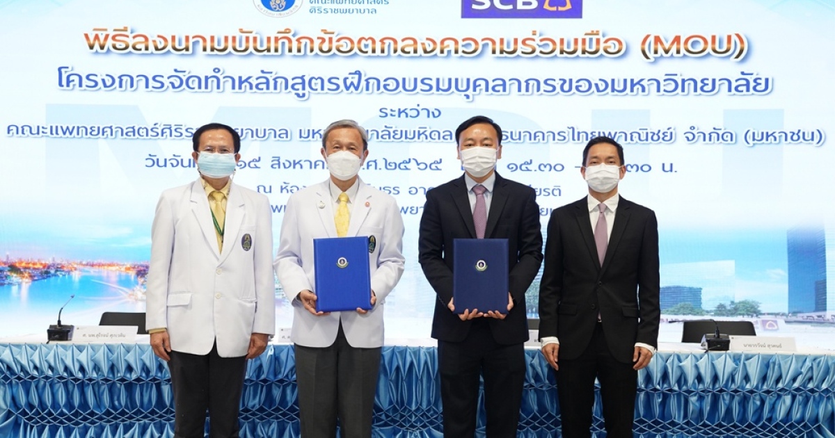 ธนาคารไทยพาณิชย์ และ คณะแพทยศาสตร์ศิริราชพยาบาล มหาวิทยาลัยมหิดล ร่วมลงนามบันทึกข้อตกลงสนับสนุนการจัดหลักสูตรการอบรมเพื่อใช้ในการฝึกอบรมให้แก่ผู้บริหาร และหรือบุคลากรของคณะแพทยศาสตร์ศิริราชพยาบาล เพื่อส่งเสริมการพัฒนาทักษะความรู้ที่มุ่งเน้นการเพิ่มศักยภาพให้กับผู้บริหารและบุคลากร และยกขีดความสามารถให้องค์กรให้สามารถปรับตัวรองรับการเปลี่ยนแปลงที่เกิดขึ้นอย่างรวดเร็ว โดยนำความเชี่ยวชาญของ SCB Academy มาพัฒนาเป็นหลักสูตรสำหรับการอบรมบุคลากรกลุ่มต่างๆ แบ่งเป็น 3 หลักสูตรหลัก ได้แก่ 1) หลักสูตร Foundation Courses เน้นการพัฒนาทางด้าน Power Skills และสร้าง Mindset ที่จำเป็นในยุคดิจิทัลสำหรับบุคลากรระดับหัวหน้างาน 2) Executive Program for Siriraj หลักสูตรผู้นำแห่งการเปลี่ยนแปลงเพื่อสร้างการเติบโตแบบก้าวกระโดด และ 3) Lean Evangelist for Siriraj สำหรับบุคลากรที่ทำงานทางด้านลีน ซึ่งเป็นหลักสูตร Train the Trainer จัดทำให้ผู้เข้าอบรมได้เรียนรู้ หลักการ เทคนิค และเครื่องมือของการเป็นวิทยากรทางด้านลีน โดยการอบรมจะเน้นสร้างองค์ความรู้และความสามารถในการเป็นผู้ฝึกสอน (Trainer) รวมถึงเป็นผู้เผยแพร่วิธีคิดและการทำงานในรูปแบบลีน ให้แก่บุคลากรในองค์กร โดยมี ศ.ดร.นพ. ประสิทธิ์ วัฒนาภา คณบดีคณะแพทยศาสตร์ศิริราชพยาบาล ศ.นพ.สุโรจน์ ศุภเวคิน รองคณบดีฝ่ายทรัพยากรบุคคล คณะแพทยศาสตร์ศิริราชพยาบาล มหาวิทยาลัยมหิดล ดร.ยรรยง ไทยเจริญ รองผู้จัดการใหญ่อาวุโส ประธานเจ้าหน้าที่บริหาร กลุ่มธุรกิจ Wholesale และรองผู้จัดการใหญ่อาวุโส ประธานเจ้าหน้าที่บริหาร กลุ่มธุรกิจ Wealth และ นายวรวัจน์ สุวคนธ์ รองผู้จัดการใหญ่ ผู้บริหารสูงสุด กลุ่มงาน SCB Academy ธนาคารไทยพาณิชย์ ร่วมพิธีลงนามบันทึกข้อตกลง เมื่อเร็วๆ นี้