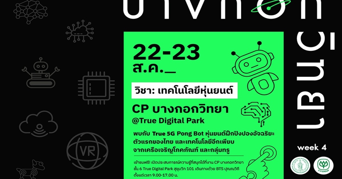 เครือซีพี จับมือ กทม. และเครือข่ายพันธมิตร จัดกิจกรรม “CP บางกอกวิทยา” ร่วมเปิดห้องเรียนวิชา “เทคโนโลยีหุ่นยนต์” ชวนเยาวชนเรียนรู้นวัตกรรม และเทคโนโลยีสุดล้ำ 22-23 สิงหาคม 2565 ที่ ทรู ดิจิทัล พาร์ค