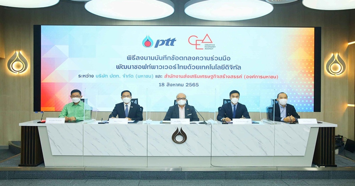 เมื่อวันที่ 18 สิงหาคม 2565 หม่อมหลวงชโยทิต กฤดากร ผู้แทนการค้าไทย ที่ปรึกษานายกรัฐมนตรี และกรรมการ บริษัท ปตท. จำกัด (มหาชน) เป็นประธานในพิธีลงนามบันทึกข้อตกลงความร่วมมือพัฒนาซอฟท์พาวเวอร์ไทยด้วยเทคโนโลยีดิจิทัล ระหว่าง บริษัท ปตท. จำกัด (มหาชน) และ สำนักงานส่งเสริมเศรษฐกิจสร้างสรรค์ (องค์การมหาชน) หรือ CEA โดยมี นายนพดล ปิ่นสุภา ประธานเจ้าหน้าที่ปฏิบัติการกลุ่มธุรกิจใหม่และโครงสร้างพื้นฐาน ปตท. ดร. บุรณิน รัตนสมบัติ รองกรรมการผู้จัดการใหญ่นวัตกรรมและธุรกิจใหม่ ปตท. ดร. ชาคริต พิชญางกูร ผู้อำนวยการสำนักงานส่งเสริมเศรษฐกิจสร้างสรรค์ และ นายพิชิต วีรังคบุตร รองผู้อำนวยการสำนักงานส่งเสริมเศรษฐกิจสร้างสรรค์ ร่วมลงนาม ณ บริษัท ปตท. จำกัด (มหาชน) สำนักงานใหญ่