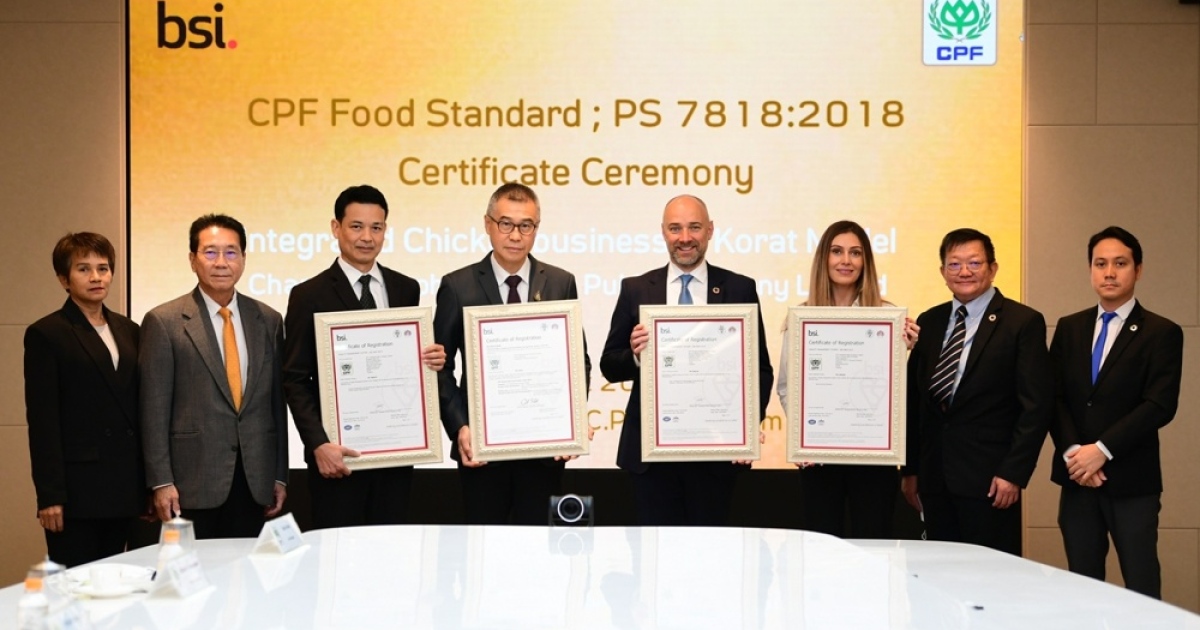 บริษัท เจริญโภคภัณฑ์อาหาร จำกัด (มหาชน) หรือ ซีพีเอฟ ตอกย้ำวิสัยทัศน์ 'ครัวของโลก' รับมอบใบประกาศนียบัตรรับรอง CPF Food Standard ภายใต้ชื่อ PS 7818 : 2018 และ ISO 9001 : 2015 จากสถาบันมาตรฐานอังกฤษ (BSI) ยกระดับมาตรฐานด้านการบริหารคุณภาพ ความปลอดภัยอาหาร และการผลิตอาหารยั่งยืน ตลอดกระบวนการผลิตแบบครบวงจร นำร่องธุรกิจไก่เนื้อครบวงจรโคราช (Korat Model) เพื่อส่งมอบคุณค่าอาหาร ด้วยมาตรฐานอาหารเดียวทั่วโลก