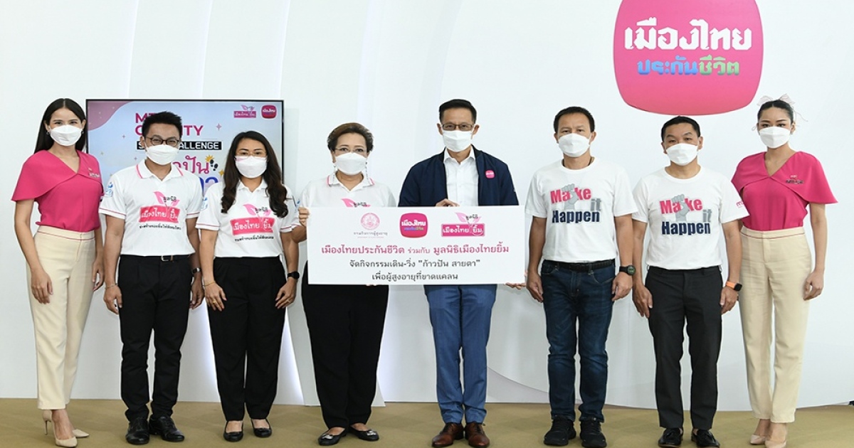 นายสาระ ล่ำซำ ประธานเจ้าหน้าที่บริหาร บริษัท เมืองไทยประกันชีวิต จำกัด (มหาชน) ร่วมกับมูลนิธิเมืองไทยยิ้ม โดยนางพิตราภรณ์ บุณยรัตพันธุ์ รองประธานกรรมการมูลนิธิเมืองไทยยิ้ม มอบเงินสนับสนุน “โครงการก้าวปันสายตา” ซึ่งได้จัดกิจกรรม Kick off ที่เชิญชวนผู้บริหารและพนักงานบริษัทฯ รวมถึงประชาชนทั่วไปร่วมกิจกรรมวิ่งจากเมืองไทยประกันชีวิต สำนักงานใหญ่ สู่จุดหมายกรมกิจการผู้สูงอายุ กระทรวงพัฒนาสังคมและความมั่นคงของมนุษย์ รวมระยะทาง 10 กิโลเมตร พร้อมสะสมก้าวเดินผ่านแอปพลิเคชัน MTL Fit ครบจำนวน 100 ล้านก้าว ภายใน 12 วัน โดยมี นายพุฒิ เด่นสมพรพันธุ์ รองกรรมการผู้จัดการ นายรัชดา พุ่มสุวรรณ รองกรรมการผู้จัดการ บริษัท เมืองไทยประกันชีวิต จำกัด (มหาชน) นางสาวอิสรีย์ ไชยหิรัญศิริ เหรัญญิกมูลนิธิเมืองไทยยิ้ม และนายธรรมปพน จันผลา ผู้จัดการมูลนิธิเมืองไทยยิ้ม ร่วมด้วย ณ เมืองไทยประกันชีวิต สำนักงานใหญ่