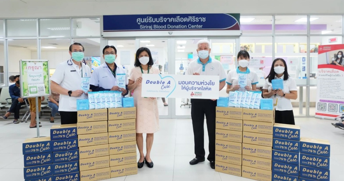 นายชาญวิทย์ จารุสมบัติ (ที่ 3 จากขวา) รองกรรมการผู้จัดการใหญ่ ดั๊บเบิ้ล เอ มอบผลิตภัณฑ์ Double A Care อาทิ หน้ากากอนามัยทางการแพทย์ และสเปรย์แอลกอฮอล์ทำความสะอาดมือ เพื่อส่งความห่วงใยและแทนคำขอบคุณ ให้กับผู้บริจาคโลหิต ณ ศูนย์รับบริจาคเลือดศิริราช โดยมี รองศาสตราจารย์ ร้อยเอกแพทย์หญิงปาริชาติ เพิ่มพิกุล (ที่ 3 จากซ้าย) หัวหน้าภาควิชาเวชศาสตร์การธนาคารเลือด โรงพยาบาลศิริราช เป็นผู้รับมอบ พร้อมทั้งเชิญชวนคนไทยร่วมบริจาคโลหิต ช่วยเหลือผู้ป่วยฉุกเฉิน ผู้ป่วยที่รอการผ่าตัด รวมถึงผู้ป่วยโรคเลือด ซึ่งยังคงมีความต้องการโลหิตอยู่เป็นจำนวนมาก สามารถร่วมบริจาคโลหิตได้ที่ ศูนย์รับบริจาคเลือด โรงพยาบาลศิริราช อาคารนวมินทรบพิตร ๘๔ พรรษา ชั้น 3