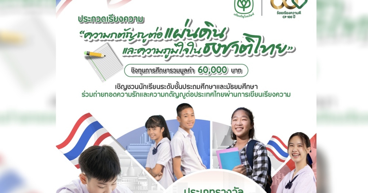 เครือซีพีน้อมรำลึกวันพระราชทานธงชาติไทย ครบรอบ 105 ปี จัดประกวดเรียงความชิงทุนการศึกษา หัวข้อ “ความกตัญญูต่อแผ่นดินและความภูมิใจในธงชาติไทย”