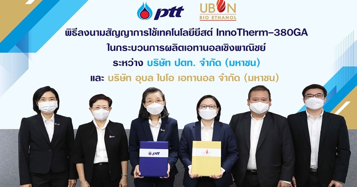 วันนี้ (19 กันยายน 2565) นางสาวอรุณรัตน์ วุฒิมงคลชัย ผู้ช่วยกรรมการผู้จัดการใหญ่ สถาบันนวัตกรรม บริษัท ปตท. จำกัด (มหาชน) (ที่ 3 จากซ้าย) และนางสาวสุรียส โควสุรัตน์ กรรมการผู้จัดการใหญ่ บริษัท อุบล ไบโอ เอทานอล จำกัด (มหาชน) (ที่ 3 จากขวา) ร่วมลงนามในสัญญาการใช้เทคโนโลยียีสต์ InnoTherm-380GA ในกระบวนการผลิตเอทานอลเชิงพาณิชย์ ระหว่าง บริษัท ปตท. จำกัด (มหาชน) (ปตท.) และบริษัท อุบล ไบโอ เอทานอล จำกัด (มหาชน) (UBE) โดยมีนางสาววิวรรณ ธรรมมงคล ผู้จัดการฝ่ายวิจัยเทคโนโลยีชีวภาพและวัสดุ (ที่ 2 จากซ้าย) นางอัมพร สุดสงวน ผู้จัดการฝ่ายแผนกลยุทธ์และบริหารนวัตกรรม บริษัท ปตท. จำกัด (มหาชน) (ซ้าย) พร้อมด้วยนายชุณห์ โภไคศวรรย์ รองกรรมการผู้จัดการใหญ่ ฝ่ายบัญชีและการเงิน (ที่ 2 จากขวา) และนายวุฒิพงศ์ นิลผาย รองกรรมการผู้จัดการใหญ่ ธุรกิจเอทานอล บริษัท อุบล ไบโอ เอทานอล จำกัด (มหาชน) (ขวา) ร่วมเป็นสักขีพยาน โดยความร่วมมือนี้ เป็นการนำเทคโนโลยีชีวภาพขั้นสูงที่ผ่านการวิจัยโดยสถาบันนวัตกรรม ปตท. มาพัฒนาสายพันธุ์ยีสต์ทนร้อนเพื่อช่วยลดปริมาณการใช้เอนไซม์ย่อยแป้งในกระบวนการผลิตเอทานอลจากมันสำปะหลัง ส่งผลให้สามารถลดต้นทุนค่าใช้จ่ายด้านเอนไซม์ย่อยแป้งลง แต่ไม่ลดประสิทธิภาพการผลิต ทั้งยังเป็นการสนับสนุนการใช้เทคโนโลยีที่พัฒนาขึ้นโดยนักวิจัยไทย ลดการพึ่งพาการนำเข้าเทคโนโลยีจากต่างประเทศ อันเป็นการสร้างเสถียรภาพทั้งในด้านเทคโนโลยีและพลังงาน เพื่อช่วยขับเคลื่อนเศรษฐกิจของประเทศให้ยั่งยืนต่อไป