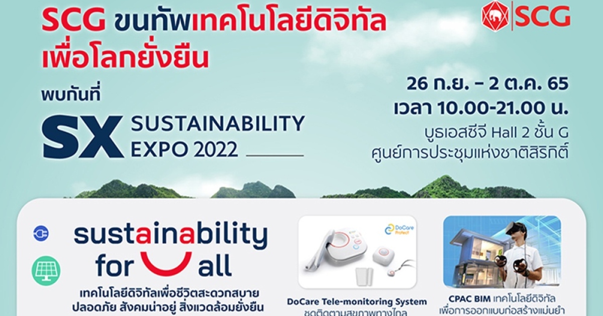 เอสซีจียกทัพนวัตกรรมและเทคโนโลยีดิจิทัลพลิกโฉมความยั่งยืนมาให้ทุกคนได้สัมผัสประสบการณ์จริงในงาน “SUSTAINABILITY EXPO 2022: GOOD BALANCE, BETTER WORLD” มหกรรมด้านความยั่งยืนที่ยิ่งใหญ่ที่สุดในอาเซียน โดยเทคโนโลยีดิจิทัลถูกถ่ายทอดภายใต้แนวคิด “Sustainability for All” ที่ทุกภาคส่วนและคนรุ่นใหม่ร่วมกันสร้างสรรค์ เพื่อชีวิตสะดวกสบาย ปลอดภัย สังคมน่าอยู่ และสิ่งแวดล้อมยั่งยืน ตามแนวทาง ESG 4 Plus ของเอสซีจี (มุ่ง Net Zero 2050 – Go Green – Lean เหลื่อมล้ำ – ย้ำร่วมมือ ภายใต้ความเชื่อมั่น โปร่งใส) พบกับ “DoCare Tele-monitoring System” ชุดติดตามสุขภาพทางไกล “SCG Solar Roof ระบบ Hybrid” ระบบหลังคาโซลาร์ เทคโนโลยีไฮบริด ใช้ไฟฟ้าได้ทั้งกลางวันและกลางคืน “Talking Faucet” ก๊อกน้ำอัจฉริยะสั่งงานด้วยเสียง รวมถึงเทคโนโลยีต้นแบบที่เอสซีจีพัฒนาร่วมกับคนรุ่นใหม่ อาทิ “Brain Computer Interface” เทคโนโลยีสั่งงานอุปกรณ์ IoT ด้วยคลื่นสมอง “Naiyana” ผู้ช่วยนำทางผู้พิการทางสายตา “Meplug” นวัตกรรมที่ชาร์จไฟ อยู่ที่ไหนก็ซื้อไฟฟ้าใช้ได้ และอีกหลากหลายนวัตกรรม เทคโนโลยีจัดเต็มที่บูธเอสซีจี
