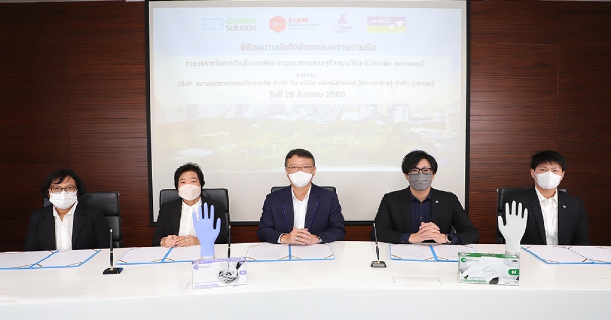 นายวิสุทธ จงเจริญกิจ ผู้อำนวยการกลุ่มธุรกิจทรัพยากรหมุนเวียน CPAC Green Solution และ นางมาลี ธนาเพิ่มพูลผล กรรมการผู้จัดการ บริษัท สยามอุตสาหกรรมวัสดุทนไฟ จำกัด ร่วมกับ นายวิทย์นาถ สินเจริญกุล กรรมการและประธานกรรมการบรรษัทภิบาลและการพัฒนาเพื่อความยั่งยืน บริษัท ศรีตรังโกลฟส์ (ประเทศไทย) จำกัด (มหาชน) ลงนามความร่วมมือด้านการจัดการสิ่งแวดล้อม ผ่านการศึกษาแนวทางการบริหารเศษวัสดุของโมลด์ต้นแบบจากการผลิตถุงมือยาง เพื่อนำไปใช้ประโยชน์ใหม่ ให้เกิดการใช้ทรัพยากรอย่างมีประสิทธิภาพสูงสุด
