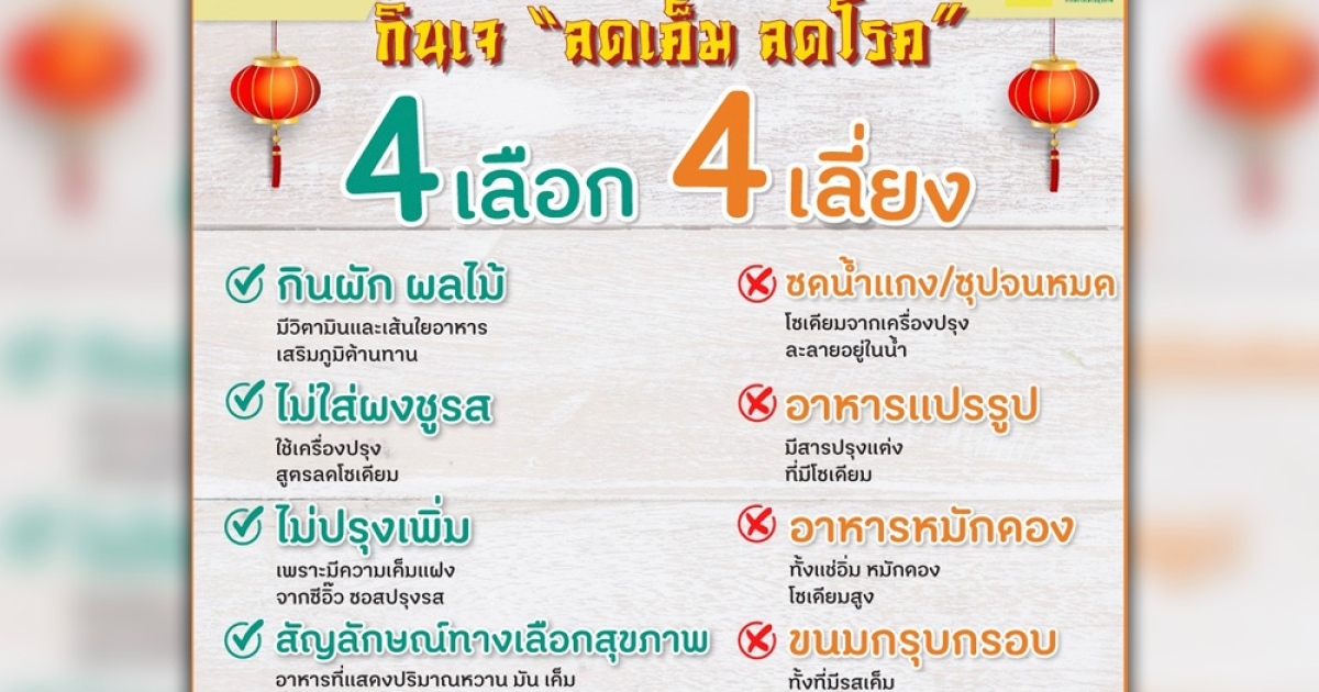 รศ.นพ.สุรศักดิ์ กล่าวอีกว่า กินเจ “ลดเค็ม เลือกได้” ใช้สูตร 4 เลือก 4 เลี่ยง 1.เลือกกินผักสด ผักหลายชนิดไม่มีโซเดียม หรือมีอยู่น้อยมาก 2.เลือกสั่งเค็มน้อย ไม่ใส่ผงชูรส 3.เลือกไม่ปรุงเพิ่ม 4.เลือกอาหารแช่แข็งที่มีฉลากโภชนาการทางเลือกสุขภาพ ส่วนพฤติกรรมที่ต้องหลีกเลี่ยง 1.เลี่ยงซดน้ำซุป กินเฉพาะเส้นและเครื่องเคียง 2.เลี่ยงอาหารแปรรูป อาหารกึ่งสำเร็จรูป 3.เลี่ยงอาหารหมักดอง 4.เลี่ยงขนมกรุบกรอบ ทั้งนี้ ได้ร่วมกับ สสส. พัฒนานวัตกรรมวัดความชาลิ้นออนไลน์ ที่เข้าใจง่าย ทดสอบพฤติกรรมติดเค็ม 5 ระดับ พร้อมรวบรวมองค์ความรู้เพื่อสร้างความเข้าใจผลกระทบต่อสุขภาพ แนวทางในการปรับเปลี่ยนพฤติกรรมลดเค็ม ผ่านเว็บไซต์ https://sodiumquiz.lowsaltthai.com/