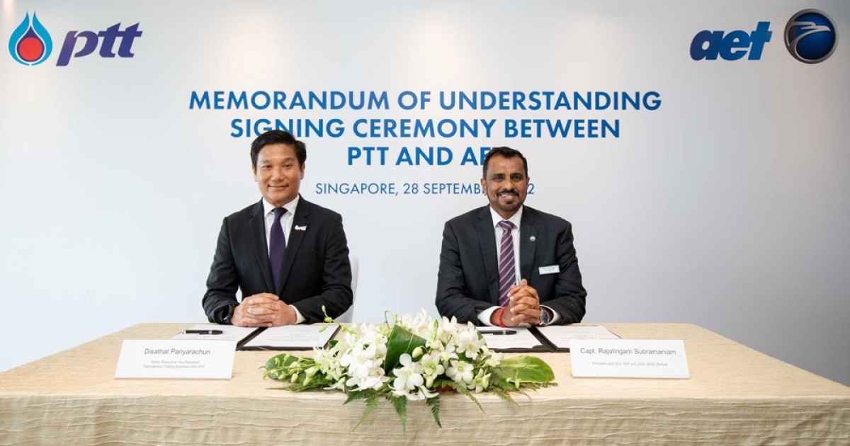นายดิษทัต ปันยารชุน รองกรรมการผู้จัดการใหญ่ หน่วยธุรกิจการค้าระหว่างประเทศ บริษัท ปตท. จำกัด (มหาชน) (ซ้าย) ลงนามในบันทึกข้อตกลงความร่วมมือศึกษา พัฒนาและสร้างเรือขนส่ง Zero-Emission Aframax ร่วมกับ Mr. Rajalingam Subramaniam AET President & CEO and MISC Group COO (ขวา) เพื่อร่วมกันศึกษาความเป็นไปได้ รวมถึงพัฒนา และสร้างเรือบรรทุกน้ำมันที่ปล่อยมลพิษเป็นศูนย์ ขนาด Aframax (ขนาดประมาณ 120,000 เมตริกตัน) ชนิดเชื้อเพลิงคู่ (Dual Fuel) คือสามารถใช้เชื้อเพลิงได้ทั้งกรีนแอมโมเนียและน้ำมันเตากำมะถันต่ำ จํานวน 2 ลํา ซึ่งหากการศึกษามีความเป็นไปได้ เรือลำแรกจะมีกําหนดส่งมอบให้กับ ปตท. เพื่อดำเนินการเช่าเหมาลําในไตรมาสที่ 4 ปี 2568 และลำที่สองในไตรมาสที่ 1 ปี 2569
