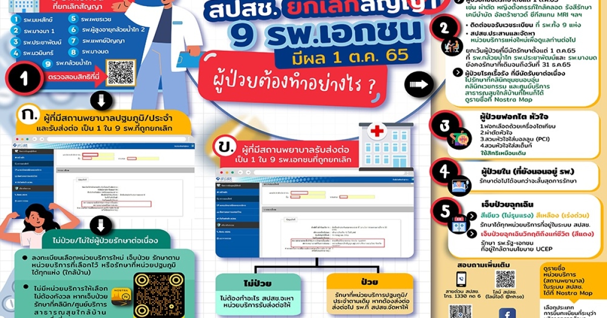ตามที่ สปสช.ได้มีการยกเลิกสัญญาการให้บริการปฐมภูมิ ประจำ และรับส่งต่อทั่วไปกับโรงพยาบาลเอกชน 9 แห่ง ซึ่งมีผลตั้งแต่วันที่ 1 ตุลาคม 2565 เป็นต้นไป โดยเป็นไปตามข้อกฎหมายจากปัญหาการเบิกจ่ายค่าบริการไม่ถูกต้อง นั้น พญ.ลลิตยา กองคำ รองเลขาธิการ สปสช. กล่าวว่า จากการหารือร่วมกับ นพ.สุขสันต์ กิตติศุภกร ผู้อำนวยการสำนักการแพทย์ กรุงเทพมหานคร และ พญ.ปิยะธิดา หาญสมบูรณ์ ที่ปรึกษากรมการแพทย์ ได้ข้อสรุปว่า ในส่วนของการหาหน่วยบริการปฐมภูมิ/ประจำแห่งใหม่ เพื่อให้ประชาชนที่ได้รับผลกระทบจากการยกเลิกสัญญา รพ.เอกชน 9 แห่ง ซึ่งตั้งแต่วันที่ 1 ตุลาคม 2565 เป็นต้นไปจะกลายเป็นสิทธิว่าง ได้ลงทะเบียนเลือกหน่วยบริการใหม่นั้น สปสช.และสำนักอนามัย จะร่วมจัดทำบัญชีเครือข่ายหน่วยบริการให้ประชากรสิทธิว่างเลือกหน่วยบริการปฐมภูมิ โดยศูนย์บริการสาธารณสุข ยินดีเป็นหน่วยบริการประจำ โดยขอให้ สปสช.จัดหาคลินิกชุมชนอบอุ่นมาเป็นหน่วยบริการปฐมภูมิเพิ่มเติมเพื่อดูแลประชาชน และได้กำหนดให้ประชาชนเริ่มลงทะเบียนเลือกหน่วยบริการปฐมภูมิ/ประจำแห่งใหม่ตั้งแต่วันที่ 10 ตุลาคม 2565 เป็นต้นไป