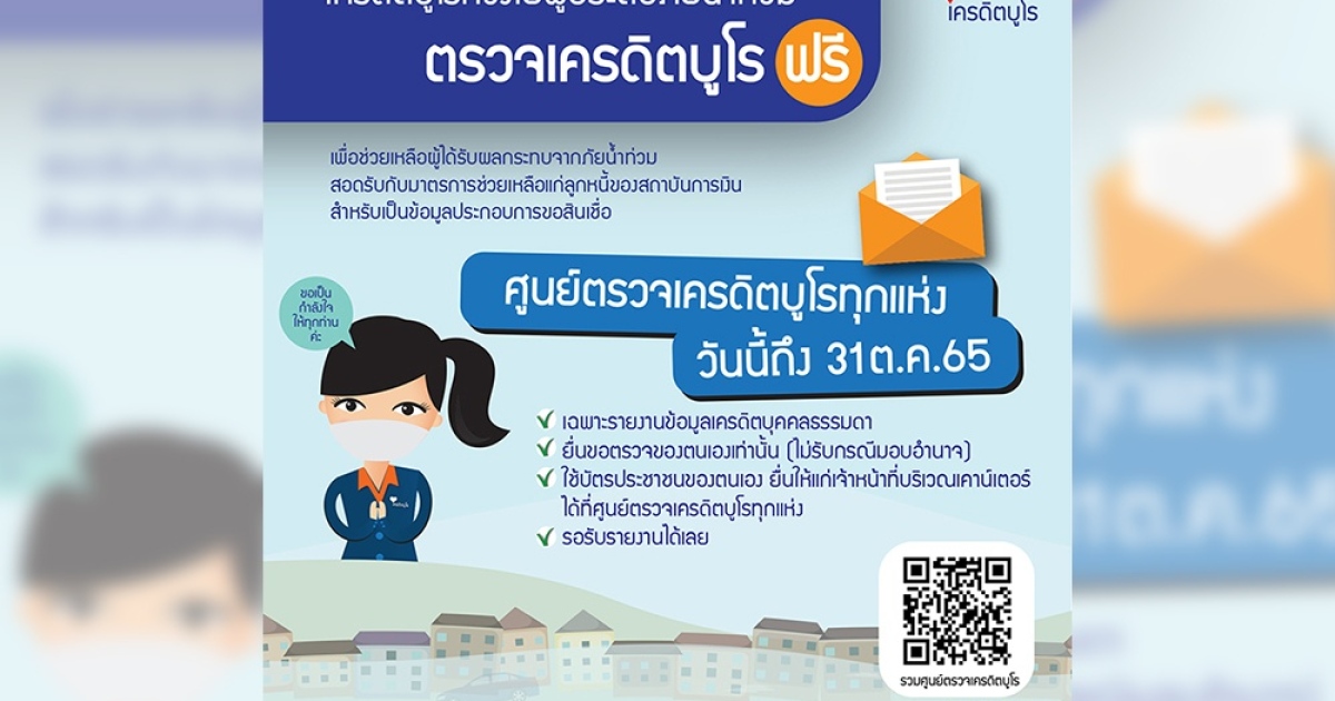 นายภูมิศักดิ์ อรัญญาเกษมสุข รองปลัดกระทรวงการคลัง ในฐานะประธานคณะกรรมการบริษัท ข้อมูลเครดิตแห่งชาติ จำกัด (เครดิตบูโร) เปิดเผยว่า “จากสถานการณ์ฝนตกอย่างต่อเนื่องในหลายสัปดาห์ที่ผ่านมานั้น ทำให้มีผู้ประสบอุทกภัยน้ำท่วมในหลายจังหวัดตามภูมิภาคต่าง ๆ เป็นจำนวนมาก ส่งผลกระทบต่อชีวิตความเป็นอยู่ และได้สร้างความเสียหายต่อทรัพย์สินของประชาชน เพื่อช่วยบรรเทาความเดือดร้อนและสอดรับกับมาตรการรองรับช่วยเหลือผู้ประสบภัยแก่ลูกหนี้ เพื่อเป็นข้อมูลประกอบในการยื่นขอสินเชื่อกับสถาบันการเงิน เครดิตบูโรขอมอบสิทธิสำหรับผู้ประสบอุทกภัยตรวจเครดิตบูโร...ฟรี ณ ศูนย์ตรวจเครดิตบูโรทุกแห่ง เฉพาะรายงานข้อมูลเครดิตบุคคลธรรมดา ยื่นขอตรวจของตนเองเท่านั้น (ไม่รับกรณีมอบอำนาจ) โดยใช้บัตรประจำตัวประชาชนของตนเอง ยื่นแก่เจ้าหน้าที่บริเวณเคาน์เตอร์ได้ที่ศูนย์ตรวจเครดิตบูโรทุกแห่ง รอรับรายงานได้เลย ตั้งแต่วันนี้ถึงเดือนตุลาคม 2565”