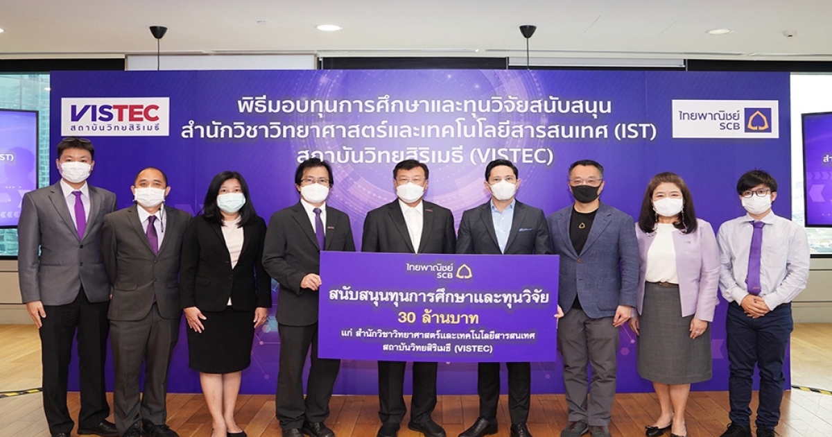 ธนาคารไทยพาณิชย์ จำกัด (มหาชน) สนับสนุนทุนการศึกษาและทุนวิจัยแก่สำนักวิชาวิทยาศาสตร์และเทคโนโลยีสารเทศ (IST) สถาบันวิทยสิริเมธี (VISTEC) ประจำปี 2565 รวมเป็นเงิน 30 ล้านบาท แบ่งเป็น ทุนการศึกษาให้แก่นิสิตระดับปริญญาโทและปริญญาเอก จำนวน 10 ทุน เป็นเงิน 20 ล้านบาท และทุนสนับสนุนการพัฒนางานวิจัย สำหรับความร่วมมือระหว่างสำนักวิชาวิชาวิทยาศาสตร์และเทคโนโลยีสารสนเทศและธนาคารไทยพาณิชย์ เป็นเงิน 10 ล้านบาท ทั้งนี้เพื่อยกระดับคุณภาพทางการศึกษาของประเทศไทย โดยเฉพาะทางด้านวิทยาศาสตร์และเทคโนโลยี ให้เป็นรูปแบบใหม่และก้าวสู่มาตรฐานชั้นนำระดับโลก สร้างบุคลากรให้เป็นผู้นำด้านงานวิจัยทางเทคโนโลยีปัญญาประดิษฐ์ และเทคโนโลยีอัตโนมัติขั้นสูง สร้างองค์ความรู้ใหม่ รวมถึงนวัตกรรม เพื่อให้ประเทศไทยมีความสามารถในการแข่งขันทัดเทียมนานาประเทศได้ ตอบโจทย์วิสัยทัศน์ของสำนักวิชาวิทยาศาสตร์และเทคโนโลยีสารสนเทศ VISTEC ในการเป็น World-class frontier research institute โดยมี ดร.ไพรินทร์ ชูโชติถาวร (กลาง) นายกสภาสถาบันวิทยสิริเมธี เป็นประธานในพิธี และคุณกฤษณ์ จันทโนทก (ที่ 6 จากซ้าย) ประธานเจ้าหน้าที่บริหาร ธนาคารไทยพาณิชย์ มอบให้แก่ ศ.ดร.จำรัส ลิ้มตระกูล (ที่ 4 จากซ้าย) อธิการบดีสถาบันวิทยสิริเมธี (VISTEC) ณ ธนาคารไทยพาณิชย์ สำนักงานใหญ่