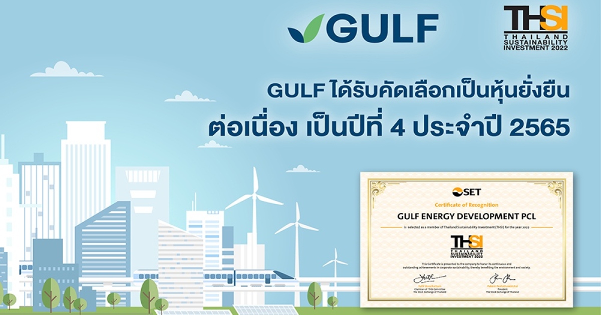 บริษัท กัลฟ์ เอ็นเนอร์จี ดีเวลลอปเมนท์ จำกัด (มหาชน) หรือ GULF ได้รับการคัดเลือกให้เป็น 1 ใน 170 บริษัทจดทะเบียนที่มีรายชื่ออยู่ในหุ้นยั่งยืน หรือ Thailand Sustainability Investment (THSI) โดยผ่านเกณฑ์การคัดเลือกให้เป็นหุ้นยั่งยืนในกลุ่มทรัพยากร (Resources) ประจำปี 2565 จากตลาดหลักทรัพย์แห่งประเทศไทยต่อเนื่องเป็นปีที่ 4 สะท้อนถึงการที่ GULF ให้ความสำคัญกับการดำเนินธุรกิจอย่างยั่งยืน คำนึงถึงการบริหารความเสี่ยง พร้อมนำข้อมูลด้านสิ่งแวดล้อม สังคม และ บรรษัทภิบาล (Environmental, Social, Governance: ESG) มาดำเนินธุรกิจ และให้ความสำคัญกับผู้มีส่วนได้เสียทุกภาคส่วน