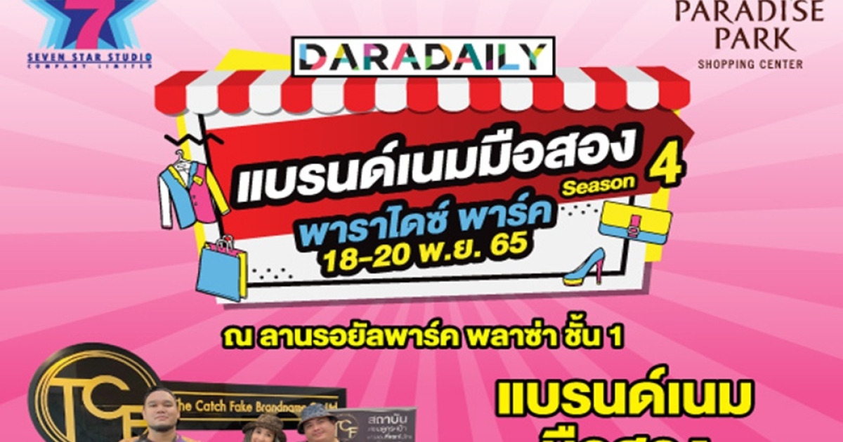 พาราไดซ์ พาร์ค ศูนย์การค้า ในเครือเอ็ม บี เค ร่วมกับ บริษัท เซเว่น สตาร์ สตูดิโอ จำกัด และ DARADAILY ชวน มาเลือกช้อปสินค้าแบรนด์เนมมือสอง สภาพดี การันตีคุณภาพ ของแท้ถูกชัวร์ จากสถาบัน TCF (The Catch Fake Brandname) ใน งาน DARADAILY แบรนด์เนมมือสอง Season 4 พบกับออกบูธจำหน่ายสินค้าแบรนด์เนมให้เลือก 40 ร้านค้า