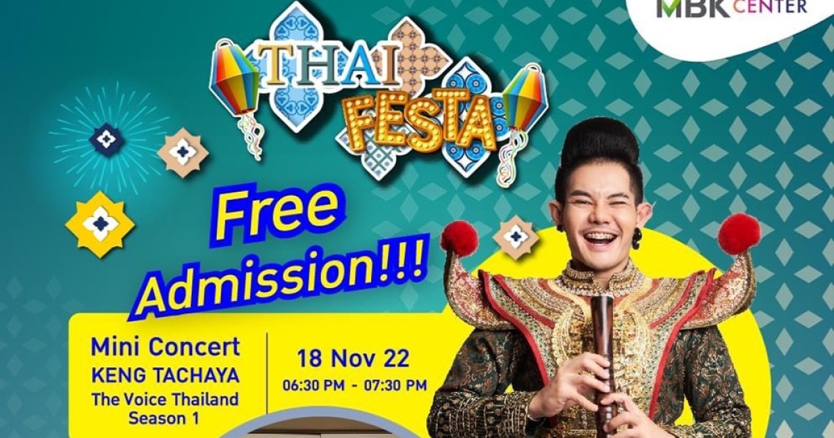 ศูนย์การค้าเอ็ม บี เค เซ็นเตอร์ เอาใจคอดนตรีชวนมารื่นรมย์ชมโชว์แบบเต็มอรรถรสกับนักร้องหนุ่มเสียงดีจากเวทีเดอะวอยซ์ เก่ง ธชย ประทุมวรรณ เปิดมินิคอนเสิร์ตให้ชมฟรีในวันศุกร์ที่ 18 พฤศจิกายน 2565 ตั้งแต่เวลา 18.30 – 19.30 น. ในงาน THAI FESTA ณ ลานกิจกรรมเอ็ม บี เค อเวนิว โซน A-B และชวนชมศิลปะการต่อสู้มวยไทยโบราณ มวยคาดเชือก ในเวลา 13.00 น. 15.00 น. 17.00 น. ของวันเสาร์ที่ 19, 26 และวันอาทิตย์ที่ 27 พฤศจิกายน 2565