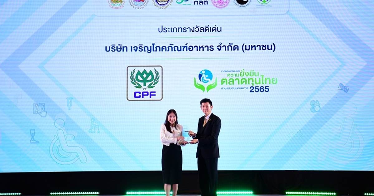 บริษัท เจริญโภคภัณฑ์อาหาร จำกัด (มหาชน) หรือ ซีพีเอฟ ได้รับรางวัล 'องค์กรต้นแบบความยั่งยืนในตลาดทุนไทย ด้านสนับสนุนคนพิการ' ระดับดีเด่นประจำปี 2565 จาก สำนักงานคณะกรรมการกำกับหลักทรัพย์และตลาดหลักทรัพย์ (ก.ล.ต.) เพื่อเชิดชูเกียรติองค์กรธุรกิจในตลาดทุนไทยที่มีศักยภาพในการสนับสนุนกลุ่มผู้เปราะบางและผู้พิการสามารถช่วยเหลือและพึ่งพาตนเองได้ ซึ่งพิธีมอบรางวัลได้รับเกียติจากนายบุญชอบ สุทธมนัสวงษ์ ปลัดกระทรวงแรงงาน เป็นผู้มอบรางวัล