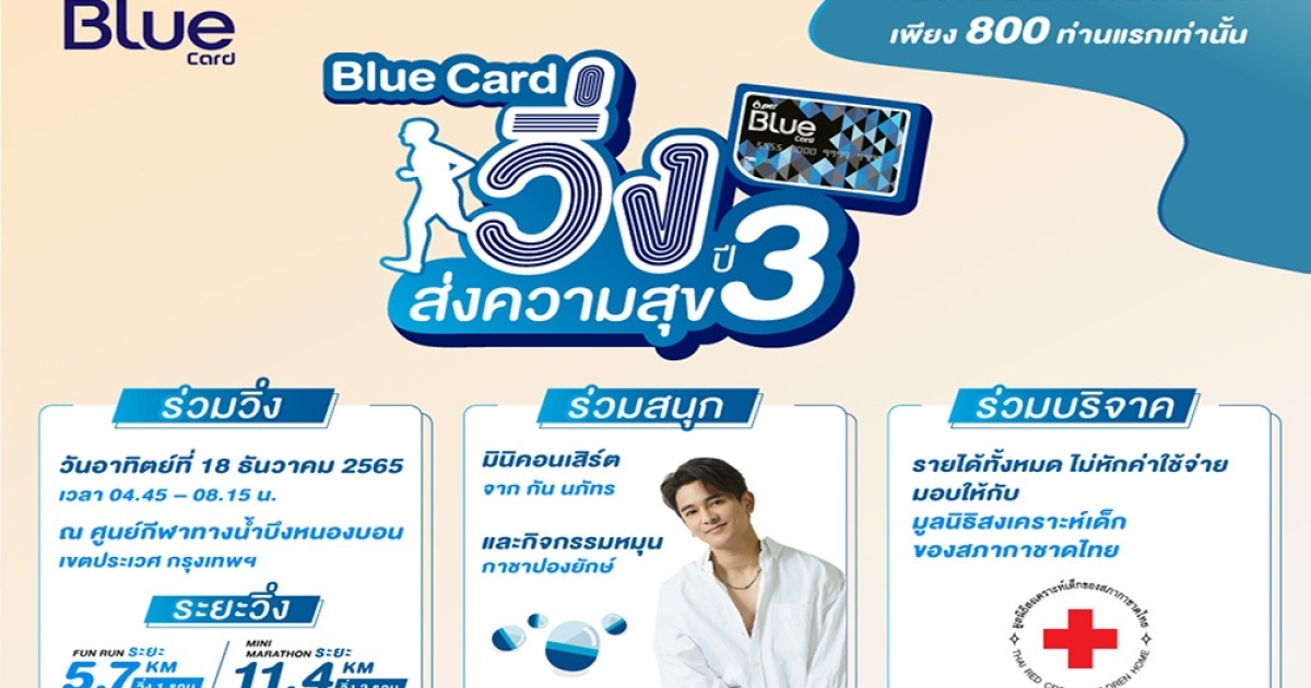 กลับมาอีกครั้งกับกิจกรรมวิ่งการกุศลแห่งปีที่ทุกคนรอคอย 'Blue Card วิ่งส่งความสุขปี 3' Blue Card ขอเชิญชวนสมาชิกทุกท่าน มาร่วมสนุกและร่วมทำกิจกรรมดี ๆ ส่งท้ายปี ในวันอาทิตย์ที่ 18 ธันวาคม 2565 ณ ศูนย์กีฬาทางน้ำบึงหนองบอน เขตประเวศ กรุงเทพมหานคร เวลา 04.45 น. - 08.15 น. พร้อมชมมินิคอนเสิร์ตส่งความสุ โดยศิลปินหนุ่มหล่อเสียงดี กัน - นภัทร อินทร์ใจเอื้อ พร้อมกิจกรรมลุ้นรางวัลใหญ่จากกาชาปองยักษ์ และความสนุกอีกมากมายที่ Blue Card จัดเต็มความพิเศษมาให้สมาชิกเท่านั้น ค่าสมัครในการร่วมกิจกรรมทั้งหมดไม่หักค่าใช้จ่ายจะมอบให้ 'มูลนิธิสงเคราะห์เด็กของสภากาชาดไทย' นอกจากนี้ ผู้ร่วมกิจกรรมยังสามารถร่วมส่งต่อพลังความดี โดยร่วมบริจาครองเท้าเก่าให้แก่ผู้ด้อยโอกาส กับ 'มูลนิธิกระจกเงา' ภายในงาน ได้อีกด้วย