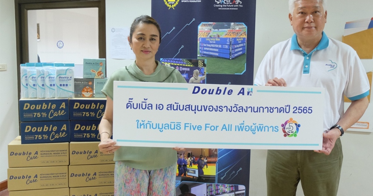 นายชาญวิทย์ จารุสมบัติ รองกรรมการผู้จัดการใหญ่ ดั๊บเบิ้ล เอ เข้ามอบผลิตภัณฑ์เพื่อสุขอนามัย Double A Care อาทิ หน้ากากอนามัย, สเปรย์แอลกอฮอล์ เพื่อจัดทำถุงของขวัญสำหรับกิจกรรมฉลากการกุศล หารายได้เข้ามูลนิธิอาสาเพื่อนพึ่ง(ภาฯ) ยามยากในงานกาชาดปี 2565 โดยมี ดร.ชนัญกร สุวรรณชื่น ประธานมูลนิธิไฟฟ์ฟอร์ออลล์ (Five For All Foundation) เป็นตัวแทนรับมอบ