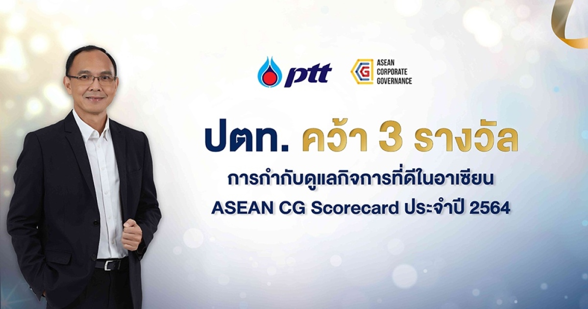 บริษัท ปตท. จำกัด (มหาชน) ได้รับผลการประเมินการกำกับดูแลกิจการที่ดีของบริษัทจดทะเบียนในอาเซียน (ASEAN CG Scorecard) ประจำปี 2564 โดยมีนายชฎิล ชวนะลิขิกร รองกรรมการผู้จัดการใหญ่บริหารศักยภาพองค์กรและธรรมาภิบาล บริษัท ปตท. จำกัด (มหาชน) เข้ารับรางวัลจากสำนักงานคณะกรรมการกำกับหลักทรัพย์และตลาดหลักทรัพย์ (ก.ล.ต.) และสมาคมส่งเสริมสถาบันกรรมการบริษัทไทย (IOD) เพื่อยกย่องและประกาศเกียรติคุณให้แก่บริษัทจดทะเบียนในอาเซียน ที่ดำเนินธุรกิจตามหลักการกำกับดูแลกิจการที่ดี ซึ่ง ปตท. ได้รับจำนวน 3 รางวัล ประกอบด้วย รางวัล ASEAN Asset Class PLCs สำหรับบริษัทจดทะเบียนที่ได้คะแนนการประเมินตั้งแต่ร้อยละ 75 หรือคิดเป็น 97.50 คะแนนขึ้นไป รางวัล ASEAN Top 20 PLCs สำหรับบริษัทจดทะเบียนที่มีคะแนนสูงสุด 20 อันดับแรกในระดับภูมิภาคอาเซียน และรางวัล Country Top 3 PLCs สำหรับบริษัทจดทะเบียนที่มีคะแนนสูงสุด 3 อันดับแรกของประเทศไทย