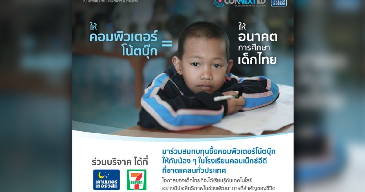 ซีพี ออลล์ ร่วมกับมูลนิธิสานอนาคตการศึกษา คอนเน็กซ์อีดี เชิญชวน ร่วมบริจาคซื้อคอมพิวเตอร์โน้ตบุ๊ก ให้โรงเรียนที่ขาดแคลน ผ่านเคาน์เตอร์เซอร์วิส ที่เซเว่นฯ ทุกสาขาตั้งแต่ 15 ธ.ค. 65 เป็นต้นไป