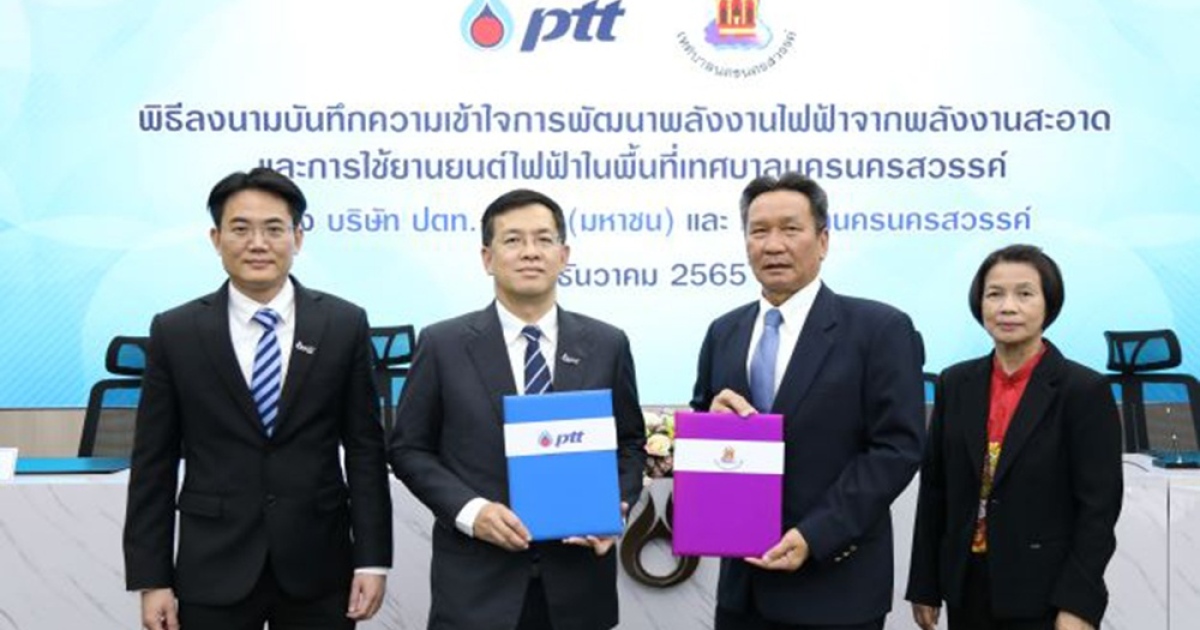 นายเชิดชัย บุญชูช่วย รองกรรมการผู้จัดการใหญ่นวัตกรรมและธุรกิจใหม่ บริษัท ปตท. จำกัด (มหาชน) (ที่ 2 จากซ้าย) พร้อมด้วย นายชาญ กุลภัทรนิรันดร์ ผู้ช่วยกรรมการผู้จัดการใหญ่พัฒนาธุรกิจใหม่ บริษัท ปตท. จำกัด (มหาชน) (ซ้าย) นายจิตตเกษมณ์ นิโรจน์ธนรัฐ นายกเทศมนตรีนครนครสวรรค์ (ที่ 2 จากขวา) และ นางสุณี มังคลารัตนศรี ปลัดเทศบาลนครนครสวรรค์ (ขวา) ร่วมลงนามบันทึกความเข้าใจการพัฒนาพลังงานไฟฟ้าจากพลังงานสะอาด และการใช้ยานยนต์ไฟฟ้าในพื้นที่เทศบาลนครนครสวรรค์ ระหว่าง บริษัท ปตท. จำกัด (มหาชน) และ เทศบาลนครนครสวรรค์ ผ่านการพัฒนาโครงการติดตั้งระบบผลิตพลังงานไฟฟ้าจากพลังงานแสงอาทิตย์ เพื่อเป็นการใช้พลังงานสะอาดและช่วยลดค่าใช้จ่ายจากการใช้พลังงานไฟฟ้า โดยความร่วมมือดังกล่าวจะติดตั้งระบบผลิตไฟฟ้าพลังงานแสงอาทิตย์แบบลอยน้ำ (Solar Floating) และแบบติดตั้งบนหลังคา (Solar Rooftop) ในพื้นที่ความรับผิดชอบของเทศบาลนครนครสวรรค์ พร้อมระบบบริหารจัดการพลังงานที่ได้จากระบบผลิตไฟฟ้าจากพลังงานแสงอาทิตย์ ตลอดจนการสนับสนุนให้มีการเปลี่ยนรถยนต์ที่ใช้ในกิจการของหน่วยงานจากชนิดเครื่องยนต์สันดาปภายในมาเป็นยานยนต์ไฟฟ้า (EV) พร้อมติดตั้งเครื่องอัดประจุไฟฟ้า (EV Charger) และระบบการใช้งานที่เกี่ยวข้อง เพื่อช่วยลดค่าใช้จ่ายในการขนส่งเดินทาง และลดมลภาวะจากการเผาไหม้จากเครื่องยนต์ อันจะเป็นส่วนช่วยในการผลักดันให้เทศบาลนครนครสวรรค์เป็นส่วนหนึ่งของการขับเคลื่อนประเทศไทยสู่การเป็นสังคมคาร์บอนต่ำ มีความพร้อมในด้าน Smart Energy และ Smart Mobility สำหรับการเป็นโครงการต้นแบบและนำร่องการก้าวเข้าสู่เมืองอัจฉริยะ (Smart City) ของจังหวัดนครสวรรค์ และสามารถเป็นแหล่งเรียนรู้แก่ชุมชนอื่น ๆ ที่สนใจเพื่อพัฒนาคุณภาพสังคม ชุมชน และสิ่งแวดล้อมให้เติบโตได้อย่างยั่งยืนร่วมกันต่อไป