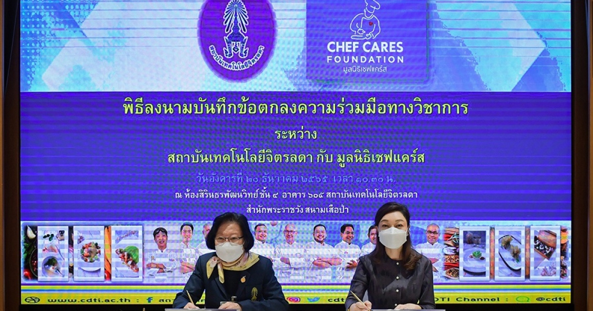 เมื่อวันที่ 20 ธันวาคม 2565 – สถาบันเทคโนโลยีจิตรลดา และมูลนิธิเชฟแคร์ส ร่วมลงนามบันทึกข้อตกลงความร่วมมือทางวิชาการ (MOU) เพื่อส่งเสริมองค์ความรู้และงานวิจัยในการสืบสานและต่อยอดสูตรตำรับอาหารไทยโบราณ ตลอดจนเปิดโอกาสให้คนรุ่นใหม่ได้มีส่วนร่วมในการผลักดันมรดกภูมิปัญญาอาหารไทยให้เป็นที่รู้จักในเวทีโลกพร้อมเป็นซอฟต์พาวเวอร์ (Soft power) สำคัญในการกระตุ้นเศรษฐกิจประเทศ โดยมีรองศาสตราจารย์ ดร.คุณหญิงสุมณฑา พรหมบุญ อธิการบดีสถาบันเทคโนโลยีจิตรลดา และนางมาริษา เจียรวนนท์ ผู้ก่อตั้งและประธานกรรมการมูลนิธิเชฟแคร์ส ร่วมลงนามในบันทึกข้อตกลงความร่วมมือดังกล่าว