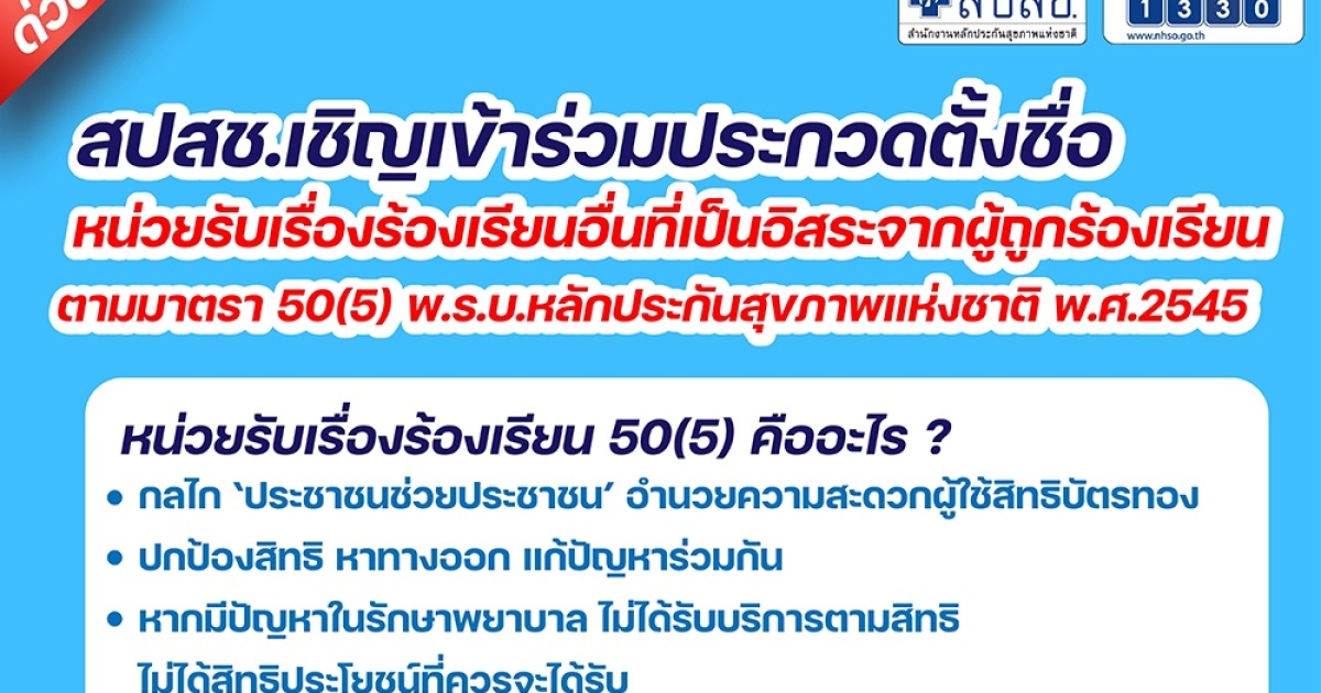 ผศ.ภญ.ยุพดี ศิริสินสุข รองเลขาธิการสำนักงานหลักประกันสุขภาพแห่งชาติ (สปสช.) กล่าวว่า ตามที่ สปสช. ได้จัดโครงการประกวดตั้งชื่อ “หน่วยรับเรื่องร้องเรียนฯ 50(5)” เพื่อให้ “หน่วยรับเรื่องร้องเรียนที่เป็นอิสระจากผู้ถูกร้องเรียน” ตามมาตรา 50(5) พ.ร.บ.หลักประกันสุขภาพแห่งชาติ พ.ศ. 2545 หรือ “หน่วยรับเรื่องร้องเรียนฯ 50(5)” เป็นที่รู้จักของประชาชนเพิ่มมากขึ้น ด้วยที่ผ่านมาประชาชนมักไม่เข้าใจว่าหน่วยนี้ทำอะไร มีประโยชน์อะไรกับประชาชน จึงชวนประชาชนที่สนใจ ไม่จำกัดอายุ เพศ วัย และระดับการศึกษามาร่วมตั้งชื่อหน่วยรับเรื่องร้องเรียนฯ 50(5) ตามความคิดสร้างสรรค์ เป็นชื่อที่ง่ายต่อการสื่อสารและสร้างความเข้าใจในบทบาทและหน้าที่ของหน่วยรับเรื่องร้องเรียนฯ 50(5)