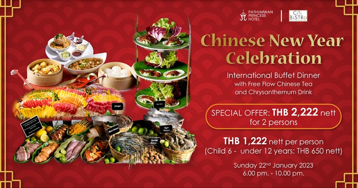 นอกจากนี้ โรงแรมฯ ยังให้บริการบุฟเฟต์นานาชาติมื้อค่ำที่ห้องอาหารซิตี้ บิสโทร ชั้น G ระหว่างเวลา 18.00 น. – 22.00 น. ในวันที่ 22 มกราคม 2566 อิ่มอร่อยกับซีฟู้ดบาร์บีคิว, ซาซิมิ, มุมอาหารจีนต้นตำรับ รวมทั้งข้าวซอย ซึ่งเป็นเมนูแนะนำของโรงแรม และได้รับการยกย่องให้เป็นอาหารประเภทซุปที่ดีที่สุดในโลก! บุฟเฟต์นานาชาติมื้อค่ำรวมชาจีนและน้ำเก็กฮวยเติมได้ไม่อั้น ในราคาท่านละ 1,222 บาทสุทธิ และพิเศษสุด เพียง 2,222 บาทสุทธิสำหรับ 2 ท่าน (เด็กอายุ 6 – ไม่เกิน 12 ปี ราคา 650 บาทสุทธิต่อท่าน)